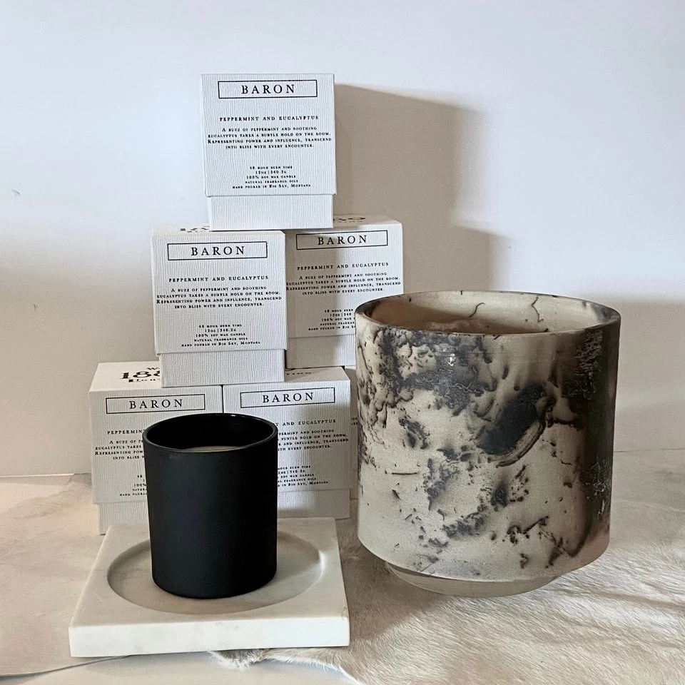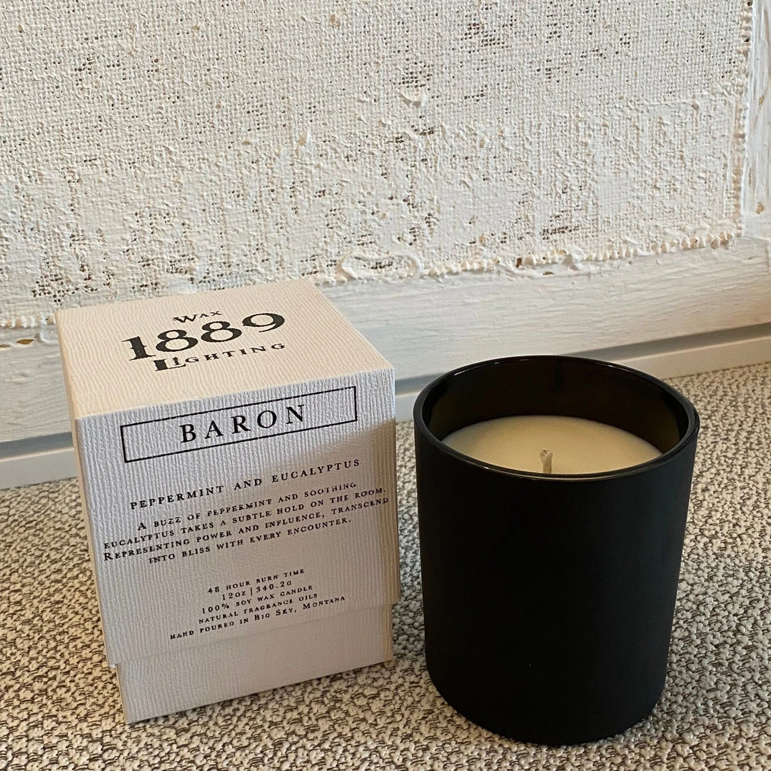 The 1889 Wax Candle in Baron is inspired by the fragrances of nature. This luxurious candle is made with pure hand-poured soy wax for a long-lasting, smokeless burn and scented with the natural fragrance oils of peppermint and eucalyptus. Handmade in Bozeman, Montana this candle is beautifully presented in a hand-thrown matte black lidded vessel and is presented in a sturdy two-piece candle box.