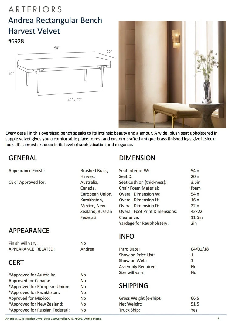 Arteriors Home presents the Andrea Rectangular Bench in Harvest, showcasing warmth and elegance. A wide, plush seat lends comfort while handcrafted antique brass finished legs offer the bench a dramatic look. Place the Andrea at the foot of the bed or use as seating in the dressing area of your closet or Master Suite.