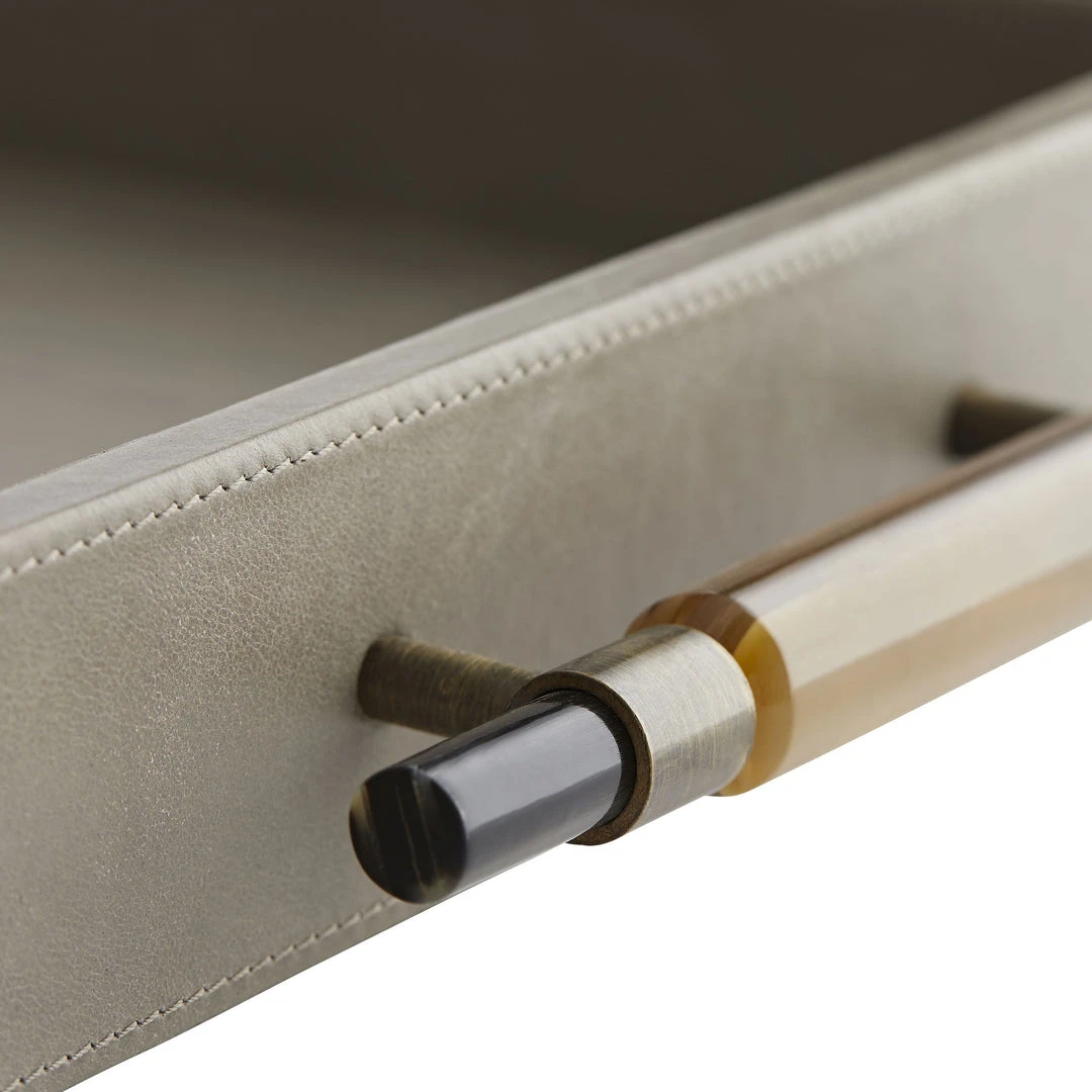 Balancing natural characteristics and modern aesthetics, the bartlett Tray from Arteriors Home epitomizes style. A classic morel leather tray is fitted with natural found-horn handles, affixed to the leather with iron finished in antique brass. The versatility of this piece allows it to double as a platform for showcasing objects, books or candles. *Finish may vary.