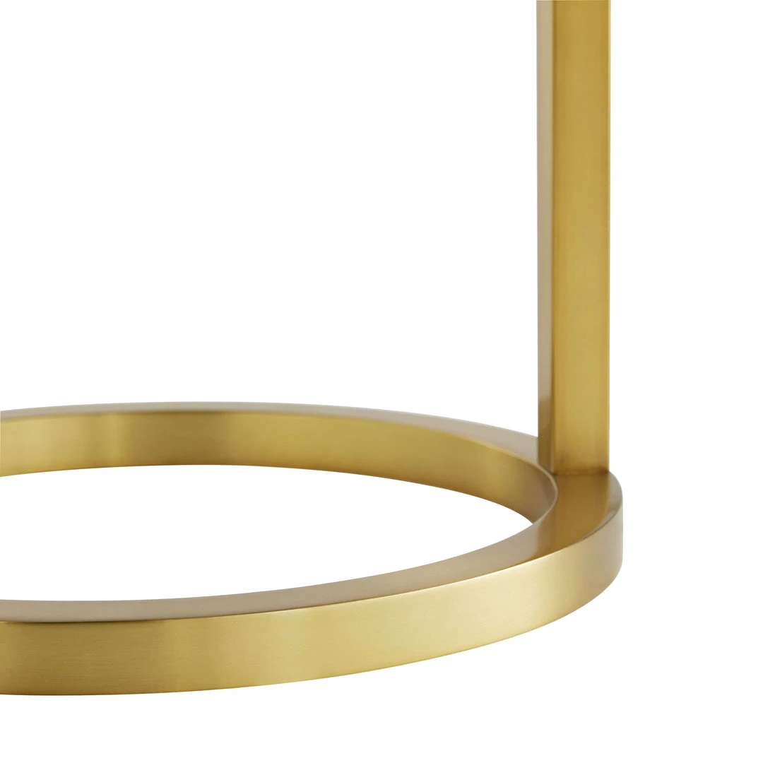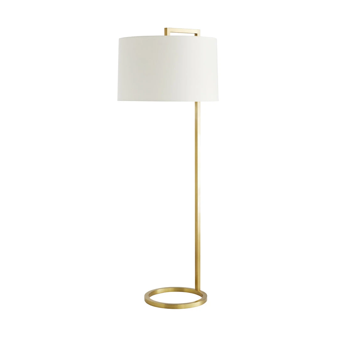 Simple and sophisticated, this Belden Floor Lamp in Antique Brass from Arteriors Home provides ample light without taking up much space. Its slender steel frame finished in a warm brass gives way to an open circular base and is paired with an off-white linen drum shade with white cotton lining. The Belden is the ideal lighting between two chairs or next to your lounge chair.