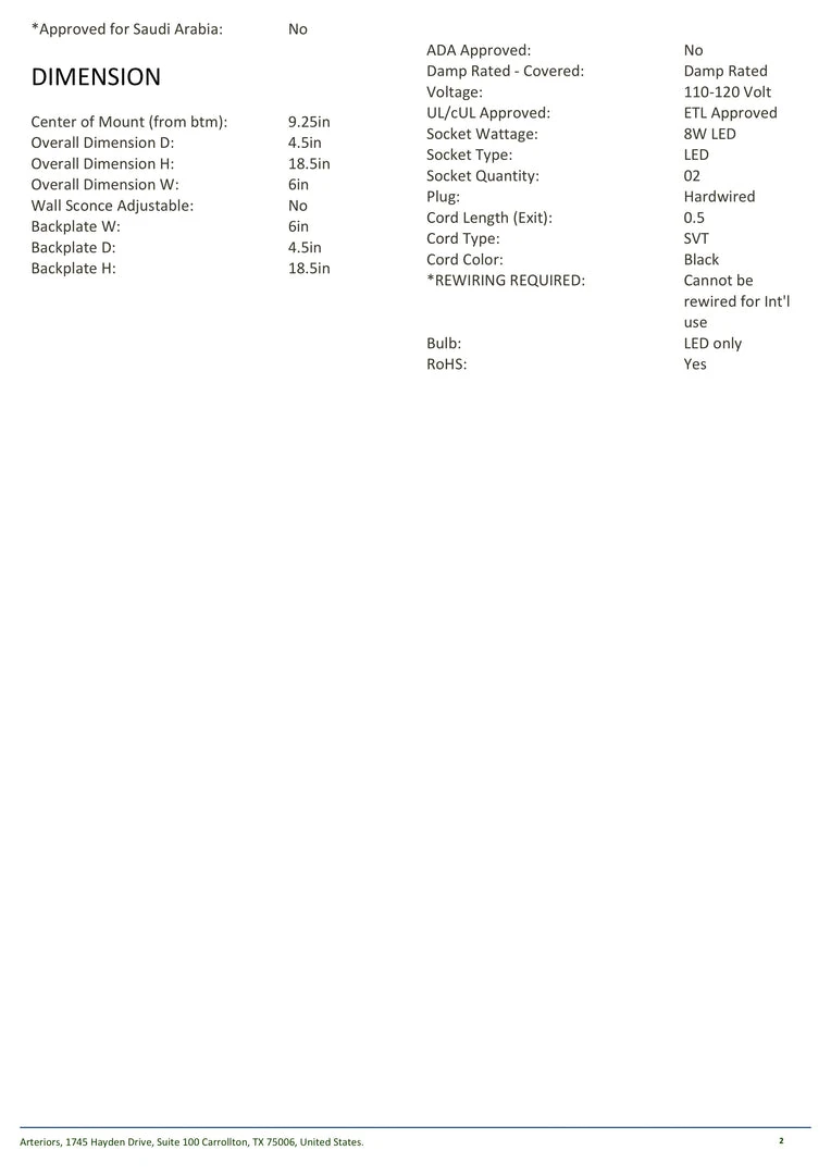 | Materials | Crystal; Steel; Antique Brass; ; Damp Rated – Covered: Damp Rated; Socket Wattage:8W LED; Socket Type: LED; Socket Quantity:02; Cord Length (Exit):0.5; REWIRING REQUIRED: Cannot be rewired for Int'l use; Bulb: LED only |