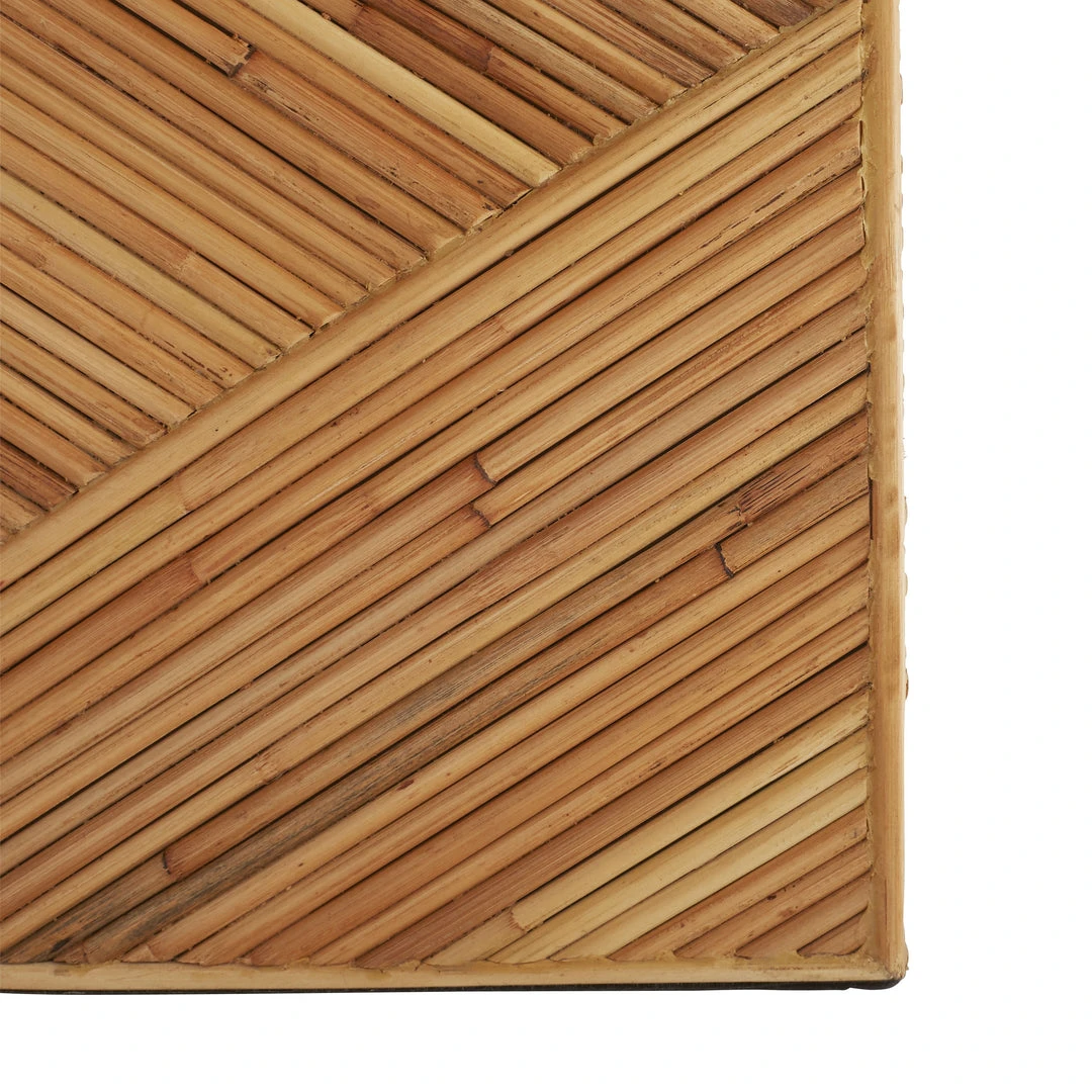 The Domingo Lamp from Arteriors Home presents a foundation inspired by vintage pencil reed rattan. This piece is modernized by an angular pattern in an opposing formation that wraps the entirety of its rectangular silhouette. Crafted of rattan in its natural form, varying tones artistically enhance the organic textures that are predominant throughout. Topped with an off-white linen rectangular shade with white cotton lining and a matching rattan finial. *Finish may vary.