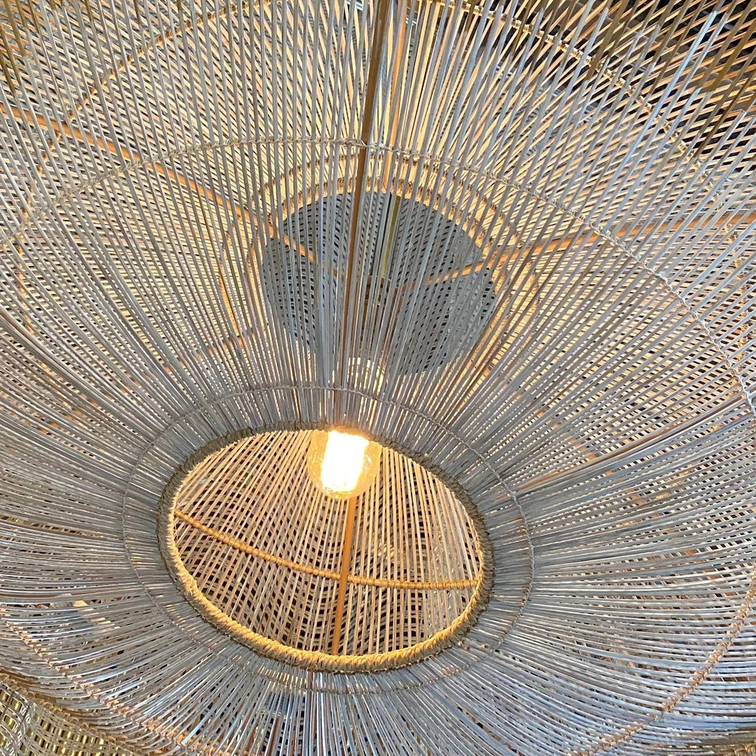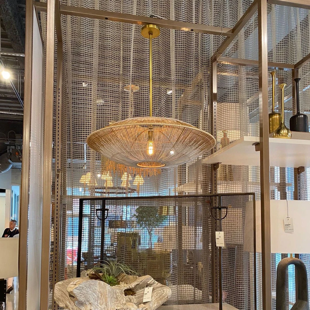 Exhibiting a mid-century silhouette, the Hadya Pendant from Arteriors Home is defined by both modern and traditional elements. Artisans delicately bend thin spines of coco midrib in natural to white ombré finish, over a saucer-shaped antique brass steel frame with abaca-wrapped edge detail. A shallow profile makes it great for small spaces. *Additional pipe available (PIPE-101). **Damp-rated, though limited outdoor conditions may affect the finish.