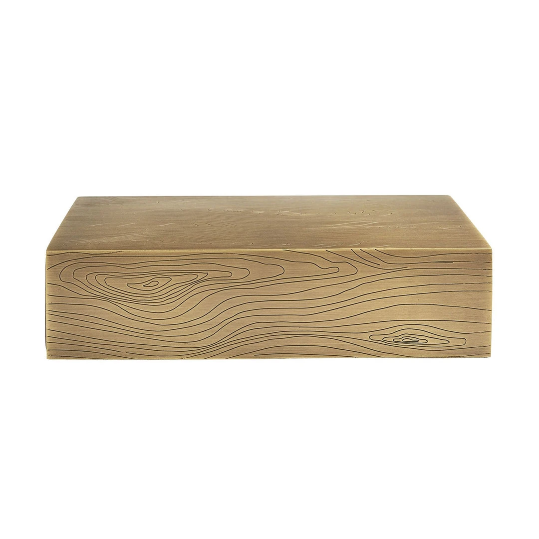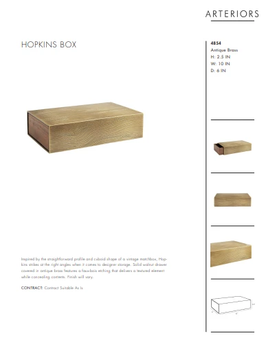Inspired by the straightforward profile and cuboid shape of a vintage matchbox, the Hopkins Box from Arteriors Home strikes at the right angles when it comes to designer storage. A solid walnut drawer covered in antique brass features a faux-bois etching that delivers a textured element while concealing contents. *Finish will vary.