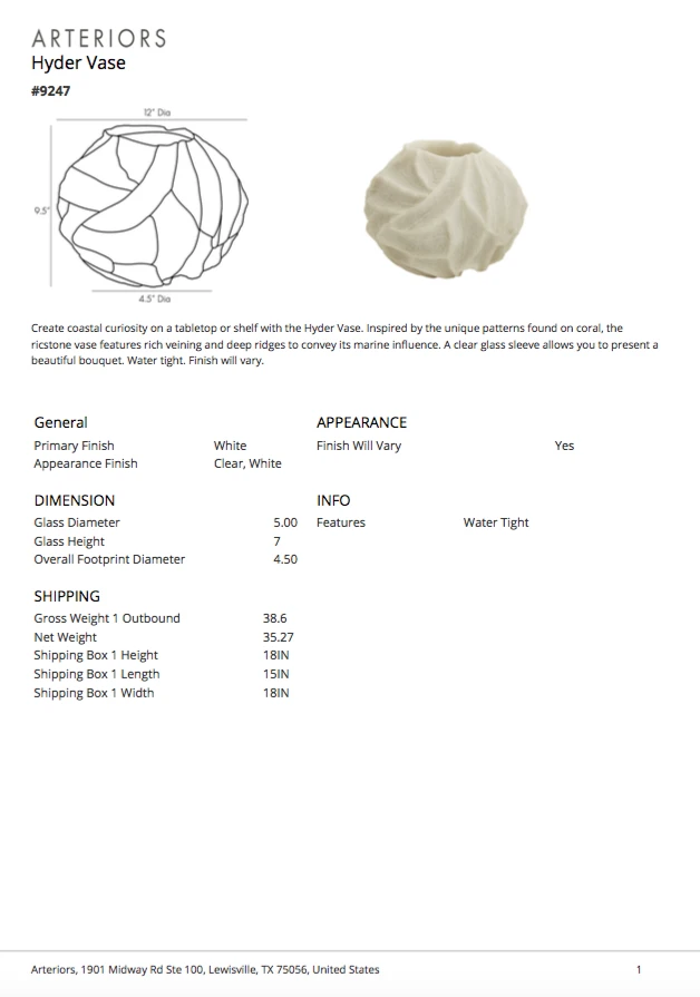Create coastal curiosity on a tabletop or shelf with the Hyder Vase from Arteriors Home. Inspired by the unique patterns found on coral, the ricestone vase features rich veining and deep ridges to convey its marine influence. A clear glass sleeve allows you to present a beautiful bouquet. Watertight. *Finish will vary.