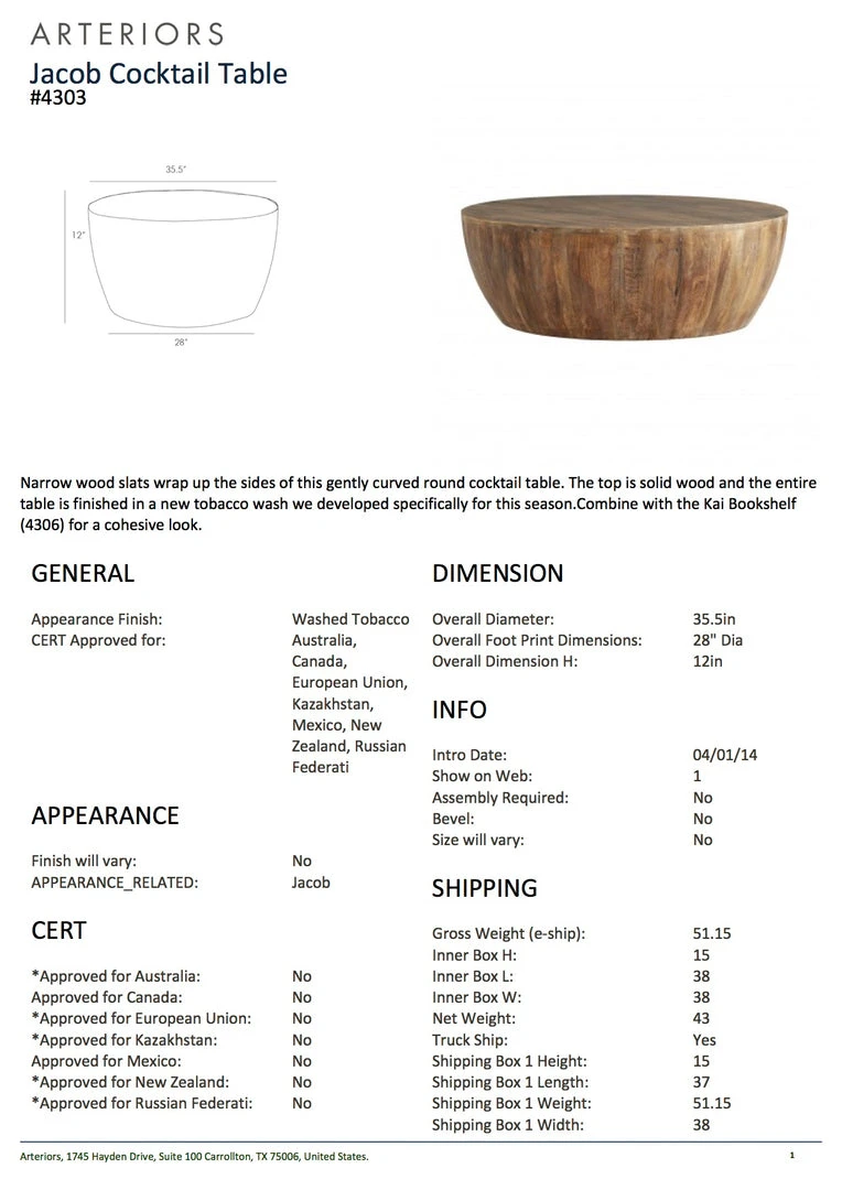 The Arteriors Home Jacob Cocktail Table features narrow wood slats wrapping up the sides of the gently curved, round table. The top of the Jacob Cocktail Table is solid wood and the entire table is finished in a new tobacco wash, developed specifically by Arteriors Home. Coffee tables like the Jacob can be used in any sitting area of the home from the living room to the sunroom!