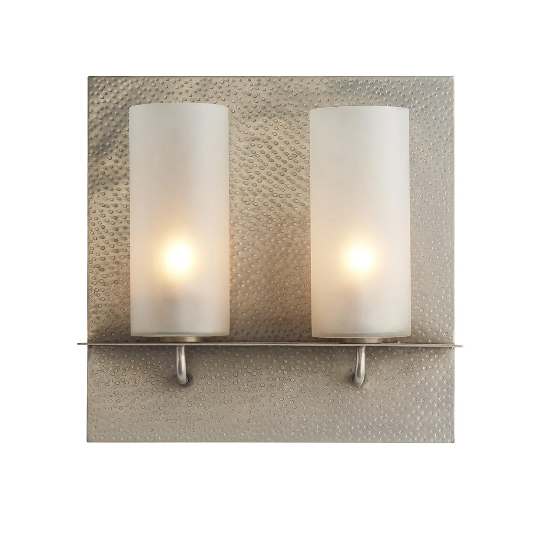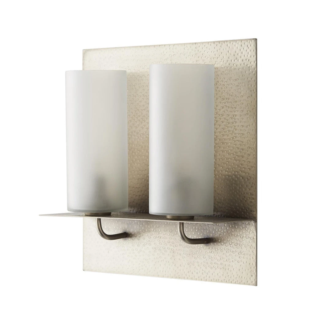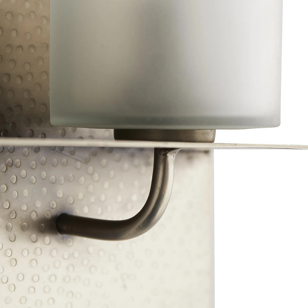 The Kady Sconce from Arteriors Home is a simplistic design. This piece features a mix of materials and is sure to bring a statement to your space. The two frosted glass shades rest on a hammered iron backplate. Sconces such as the Kady Sconce are ideal for hallways and foyers. Finish may vary.