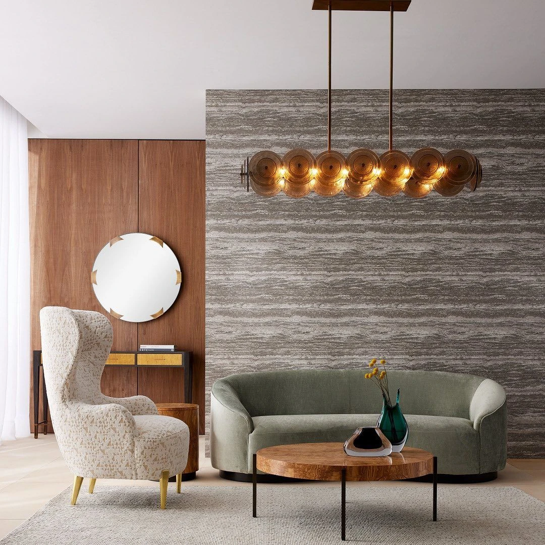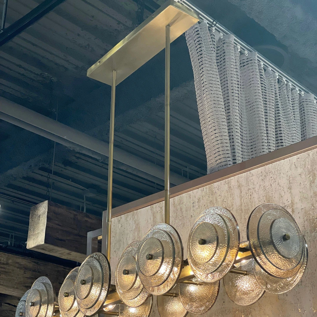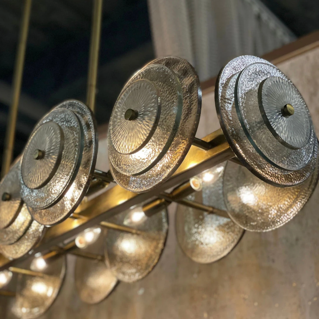 A modern take on Art Deco, the Kinlee Chandelier from Arteriors Home is composed of a series of handcrafted glass discs on a linear frame with 12 lights sparkling through the glass. A collage of clear glass, smoke glass, and smoke luster glass discs parallel an antique brass iron frame. The clear glass and smoke glass feature a hammered detail, while the smoke luster glass features an etched texture. *Finish will vary.