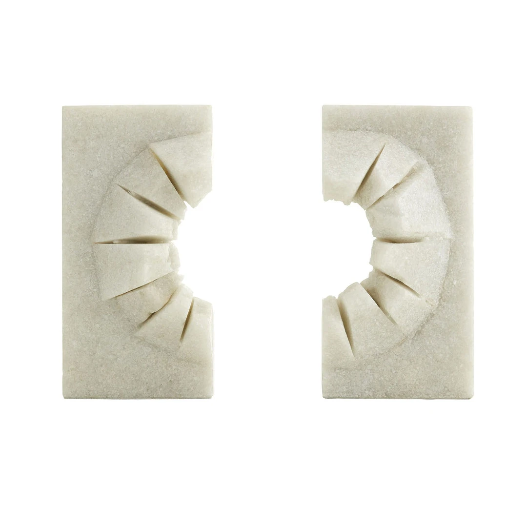 The jagged features of the Kylo Bookends from Arteriors Home create an explosive illusion. Drawing the eye in for a compelling intersection of form and function. Artistically cast in the rich texture of ivory ricestone, Smooth and rough surfaces contrast to provide a dramatic sculptural element to a bookcase or tabletop. *Ricestone will vary.