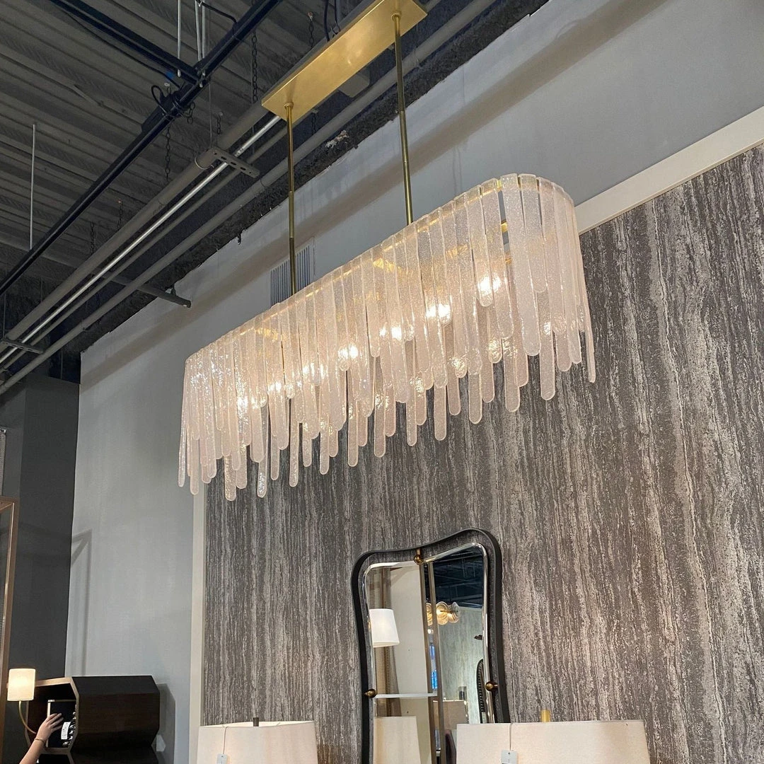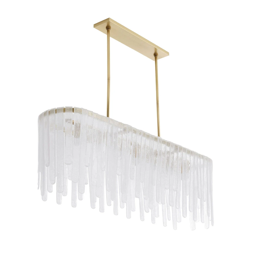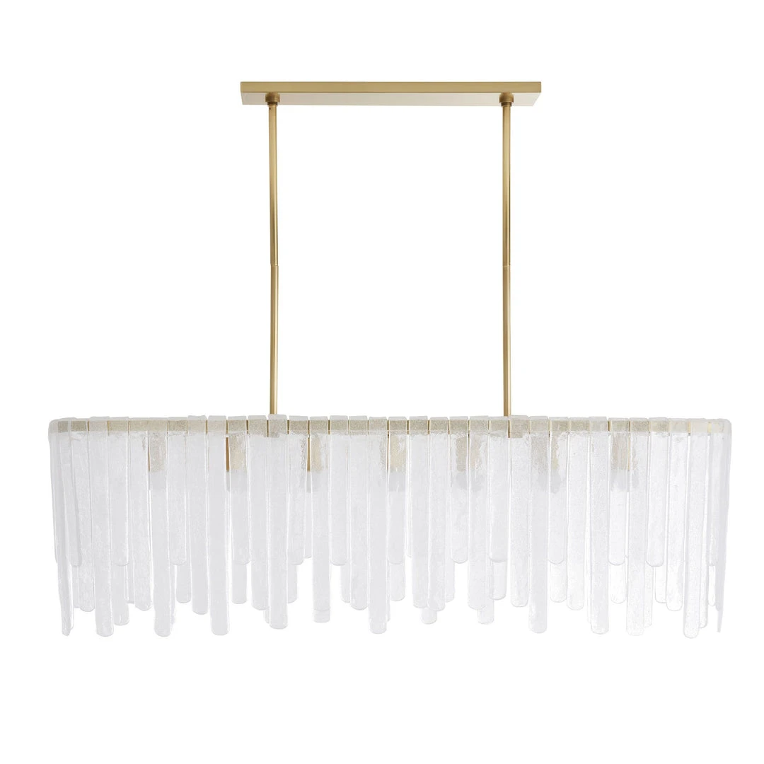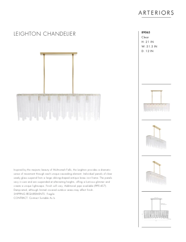 Inspired by the majestic beauty of Multnomah Falls, the Leighton Chandelier from Arteriors Home provides a dramatic sense of movement through each unique cascading element. Individual panels of clear seedy glass suspend from a large oblong-shaped antique brass iron frame. The panels vary in size and are suspended at alternating heights, offering a lustrous glimmer to your space.