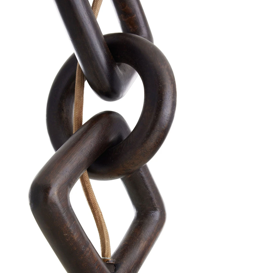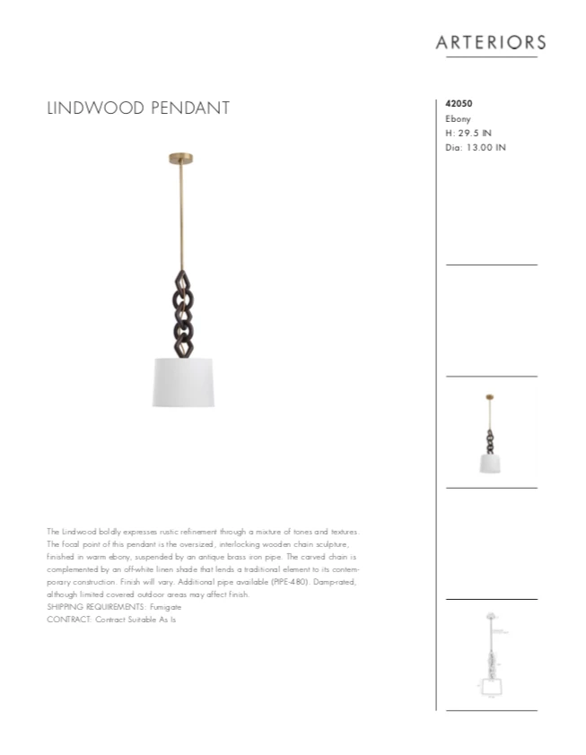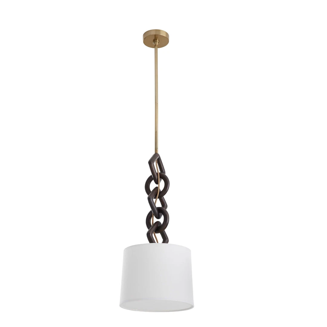 The Lindwood Pendant from Arteriors Home boldly expresses rustic refinement through a mixture of tones and textures. The focal point of the pendant is the oversized, interlocking wooden chain sculpture finished in warm ebony, suspended by an antique brass iron pipe. The carved chain is complemented by an off-white linen shade that lends a traditional element to its contemporary construction.