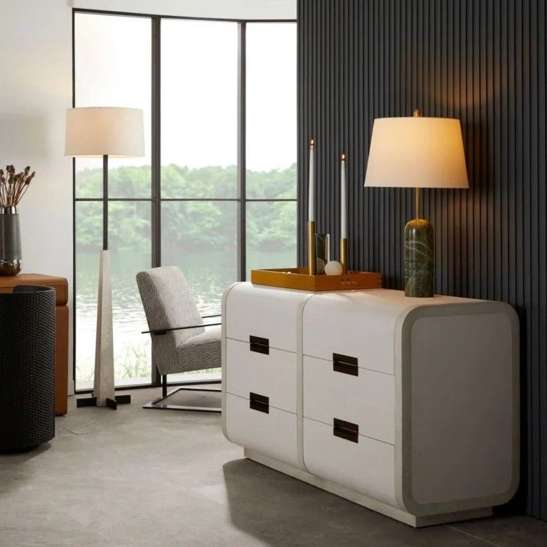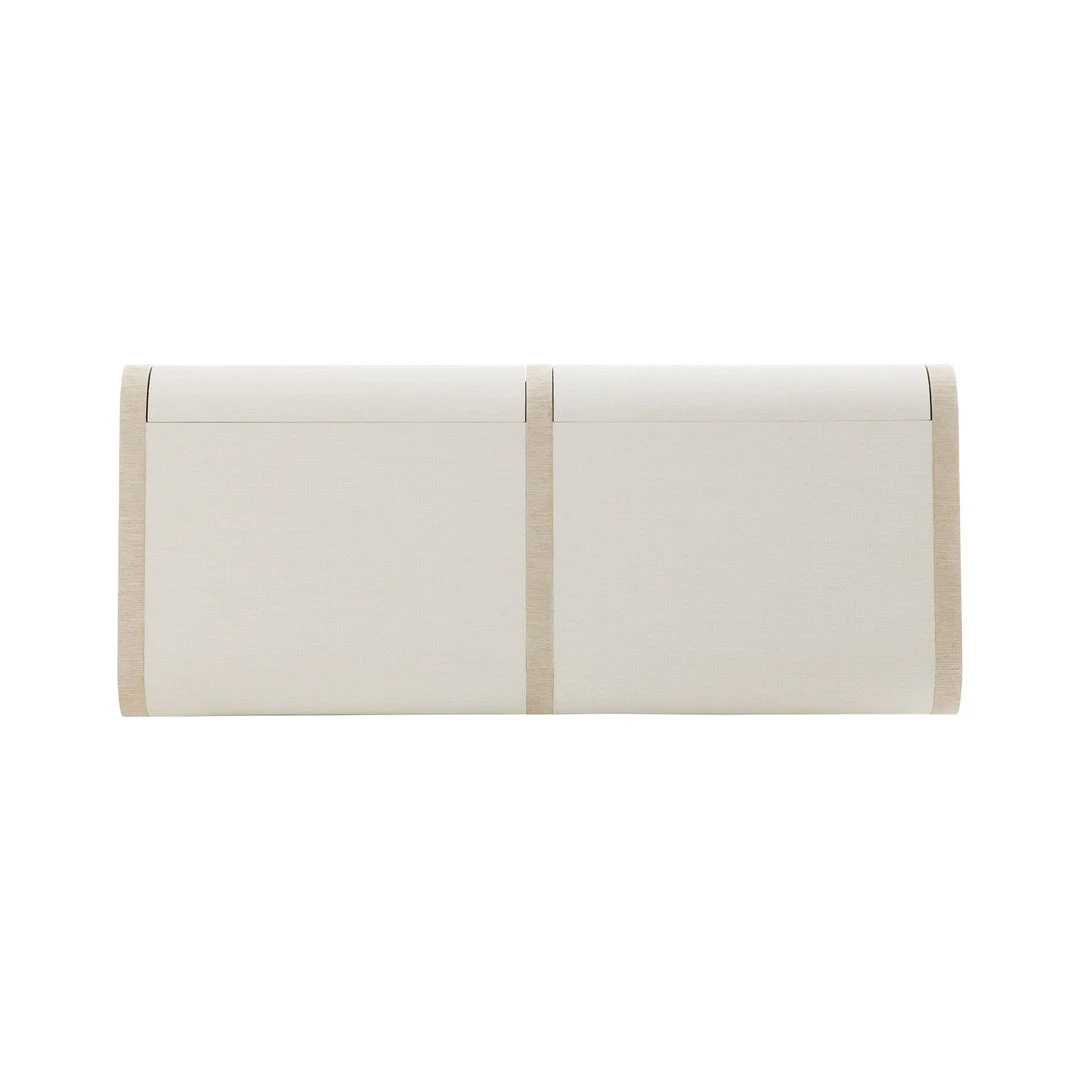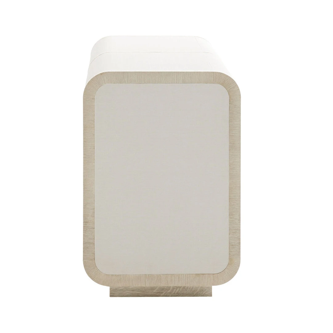 The Madison Chest from Arteiors Home brings a contemporary twist to a classic modern design The beige seagrass cloth construction is met with a matching beige oak veneer and large bronze-finished brass hardware – a beautiful blend of tones and textures. The top of the chest is curved to follow the arched silhouette down to the drawers and further enhances its modern aesthetic. *Wood and finish will vary.