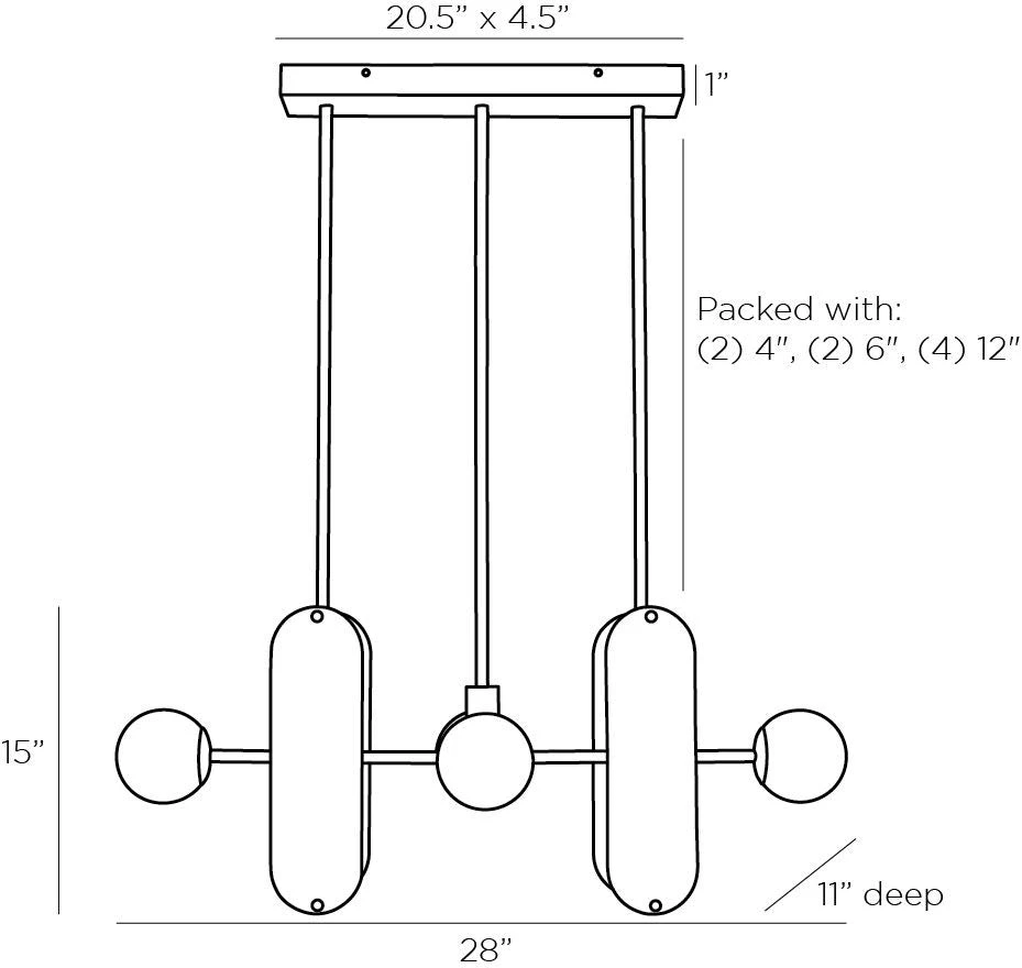 The Maradona Pendant from Arteriors Home is an English* bronze iron frame with white alabaster shades. Each globe/panel is integrated LED for ample light. Additional pipe available (PIPE-490). Damp-rated, although limited covered outdoor areas may affect the finish. Alabaster will vary.