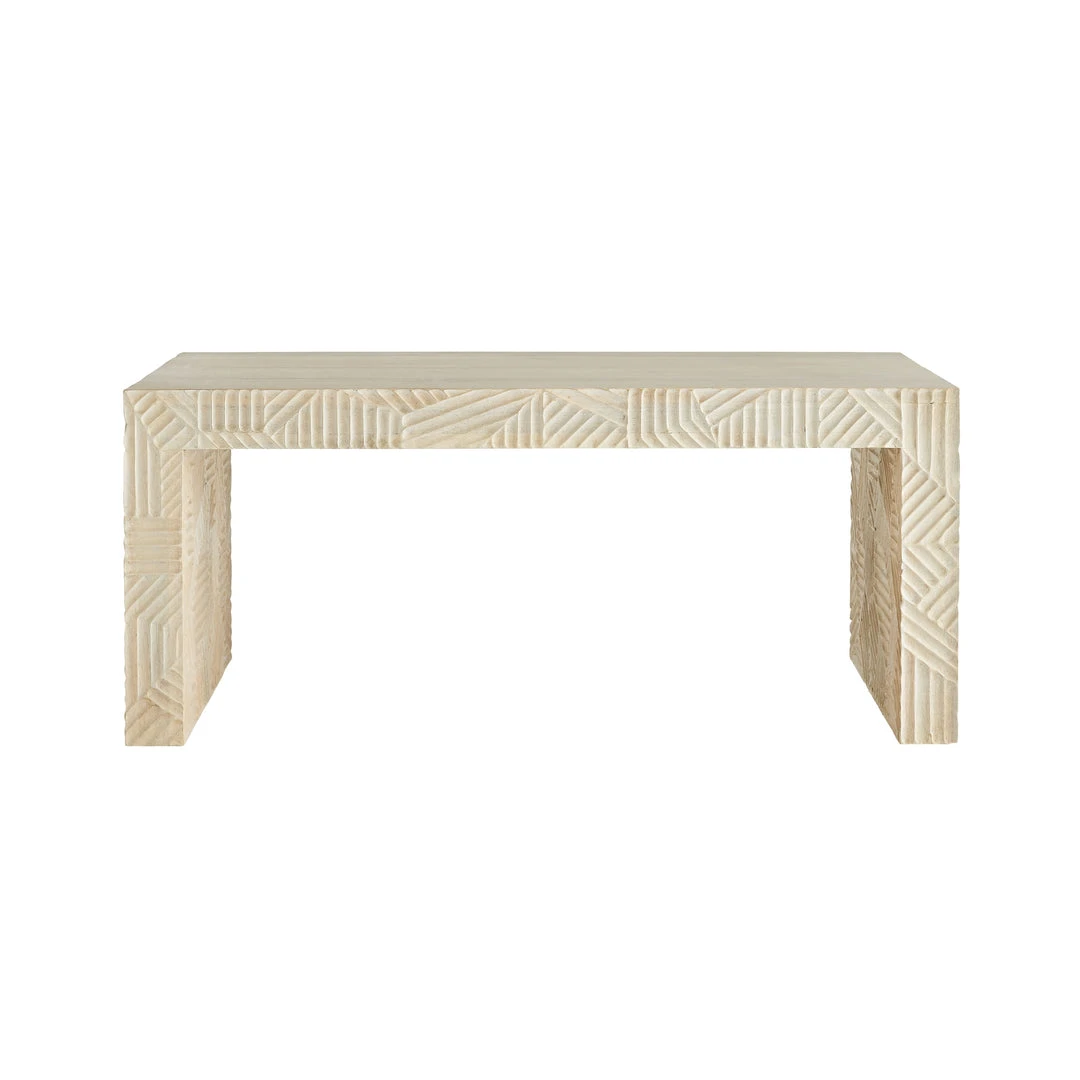The Marsh Bench Cocktail Table plays with elements that are recurrent in Beth Webb’s body of work. Texture, tension, and serene tones highlight the carved blonde wood from Arteriors Home, which was inspired by a contemporary Italian woodworker. A smooth, tactile top contrasts the dramatic texture of the base. The Marsh is modular in concept and can be paired with the Marsh End Table for a chic, designer look.