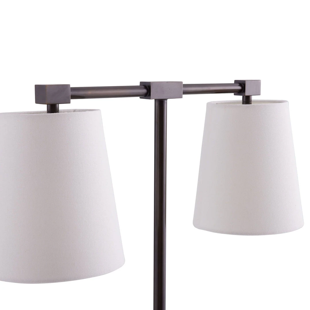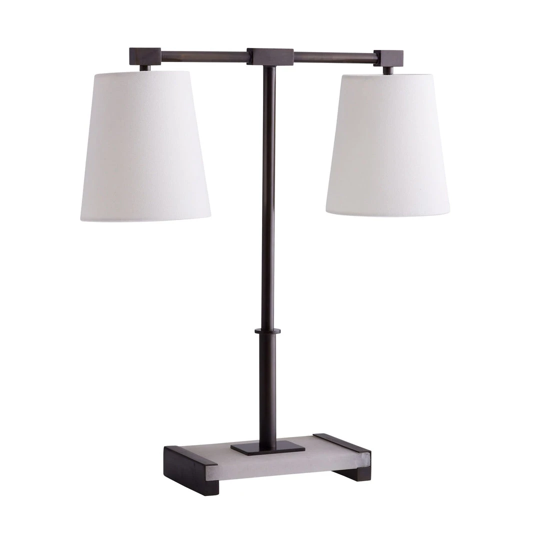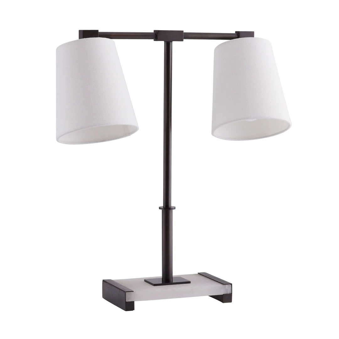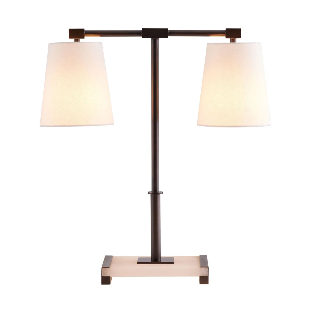 The classic library silhouette of the Messina Lamp in Bronze from Arteriors Home provides a beautiful balance to any tabletop. A slender, double-arm frame of bronze steel presents two tapered, off-white linen shades with an off-white cotton lining. The white alabaster base inset in a matching bronze steel frame for a more cohesive look. Finish will vary.