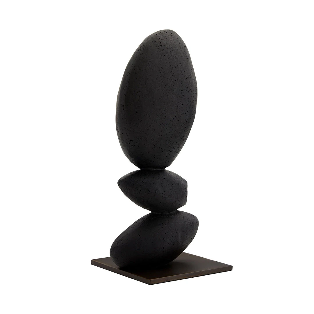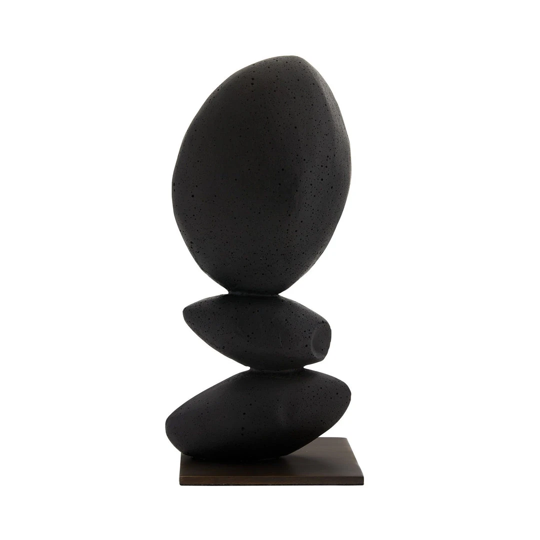 Infuse Zen into a collection with the Milton Sculpture from Arteriors Home. This charcoal rice stone sculpture, inspired by rock cairns found on hiking trails, its small scale allows it to nest perfectly with a spread of other collected finds or anywhere that could use a little bit of style. The stack rests on a flat base of dark antiqued brass-finished steel. *Ricestone will vary.