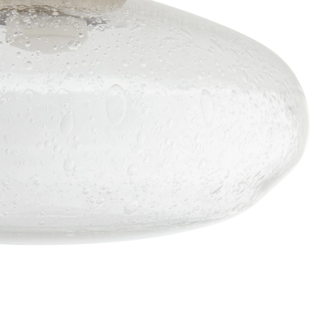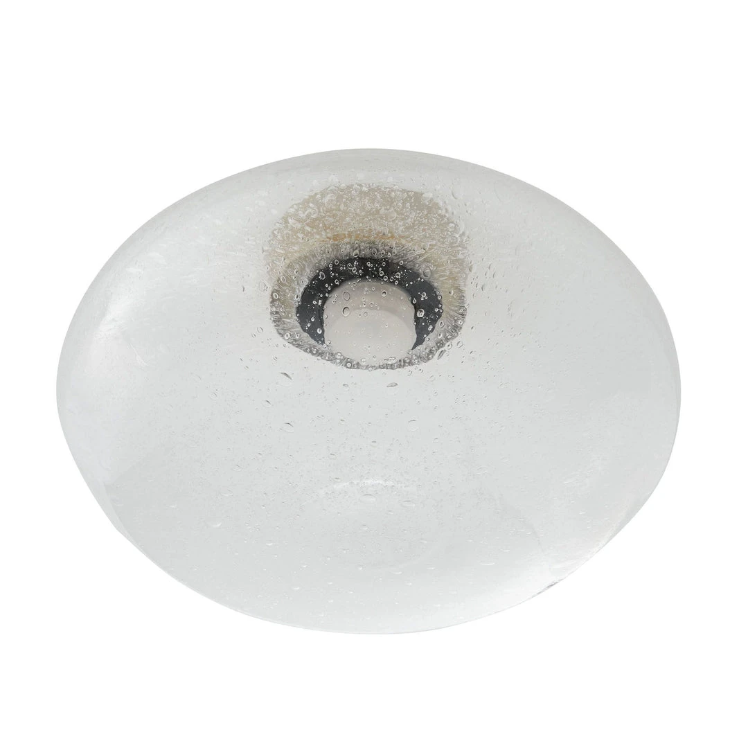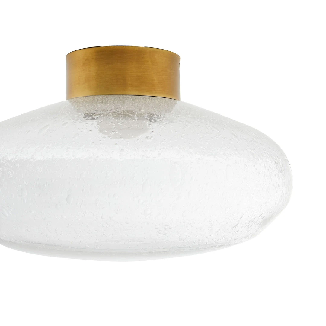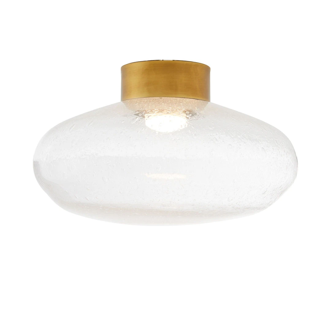 The Mission Flush Mount from Arteriors Home takes classic flush mount design to a new level by pairing clear seedy glass with antique brass steel. An LED light elevates its modern aesthetic and offers a soft glow to its surroundings. when illuminated, the tiny bubbles catch the lights and highlight the delicate intricacies. Damp-rated although the limited covered outdoor area may affect the finish.