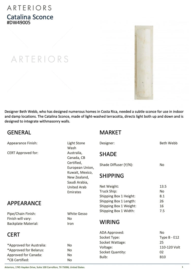 Designer Beth Webb, who has designed numerous homes in Costa Rica, needed a subtle sconce for use in indoor and damp locations. The Catalina Sconce from Arteriors Home is made of light-washed terracotta, directing light both up and down, and is designed to integrate with masonry walls. The perfect wall light for living spaces and office environments alike.