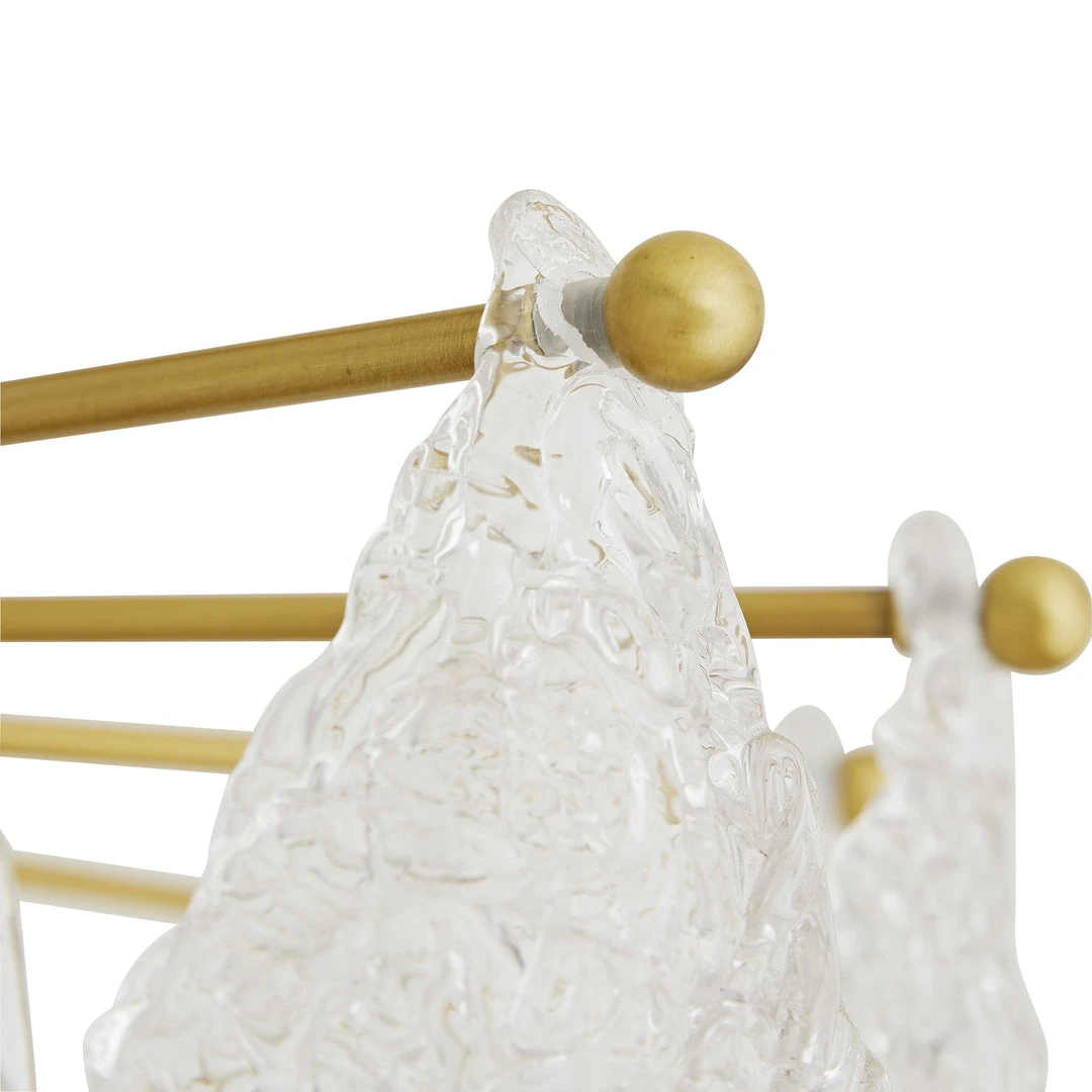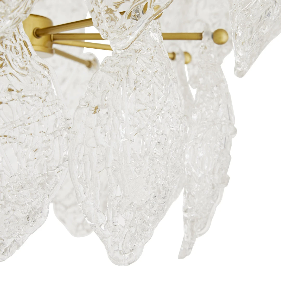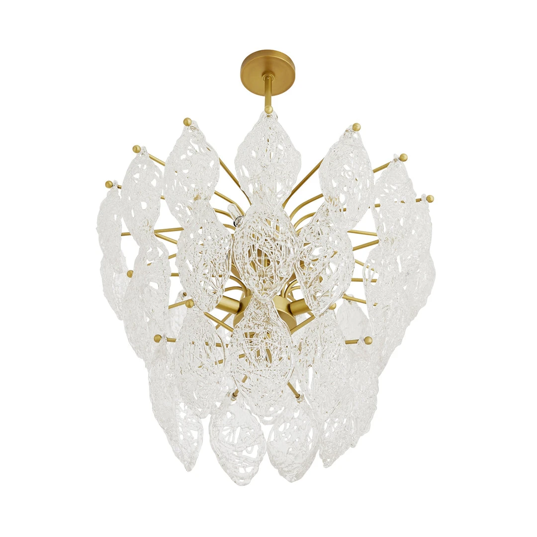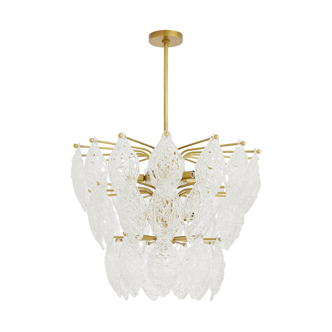 An artisanal masterpiece, in a class of its own, the Delilah Chandelier from Arteriors Home delivers a stunning light for your home. Skilled glass-makers scattered pieces of the transparent material into a mold to create the spaghetti glass teardrop formations that define this eight-light chandelier. An antique brass foundation showcases three descending tiers to create its classic—though far from ordinary—waterfall silhouette. *Finish and glass may vary. *Damp-rated, although limited covered outdoor conditions may affect the finish.
