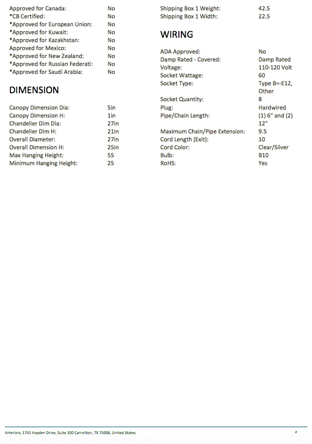 | Materials | Steel; Glass; Antique Brass; Damp Rated – Covered: Damp Rated; Socket Wattage:60; Socket Type: Type B=-E12 Other; Socket Quantity:8; Pipe/Chain Length:(1) 6" and (2) 12"; Maximum Chain/Pipe Extension:9.5; Cord Length (Exit):10; Bulb:B10 |