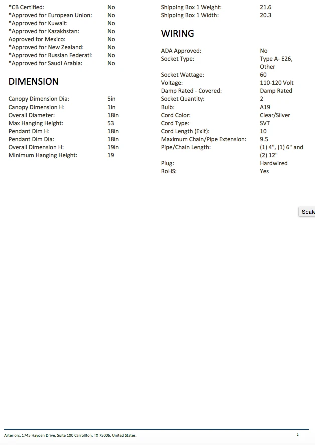 | Materials | Glass; Steel; Socket Type: Type A- E26 Other; Socket Wattage:60; Damp Rated – Covered: Damp Rated; Socket Quantity:2; Bulb:A19; Cord Length (Exit):10; Maximum Pipe Extension:9.5; Pipe Length:(1) 4";(1) 6" and (2) 12" |