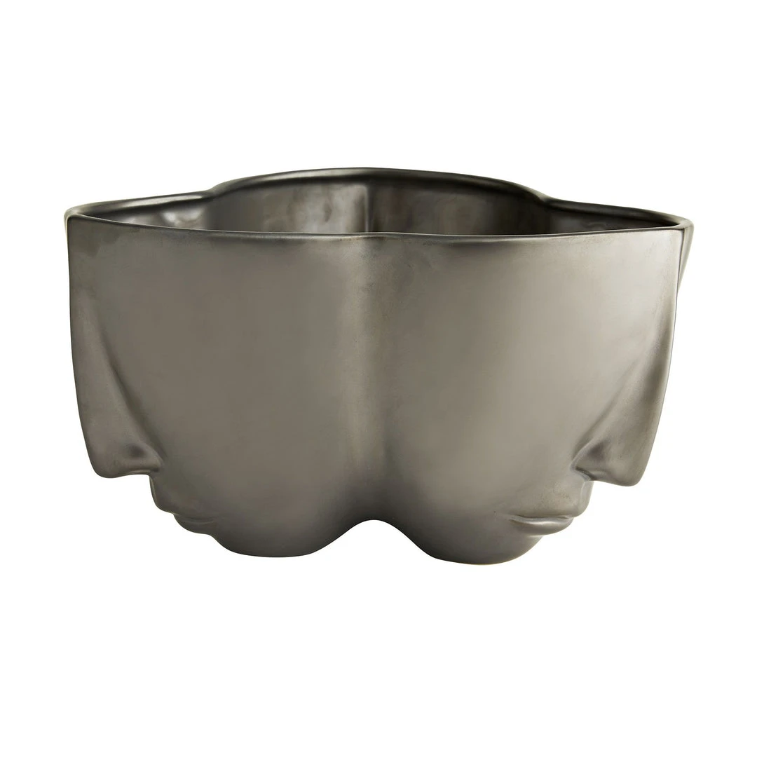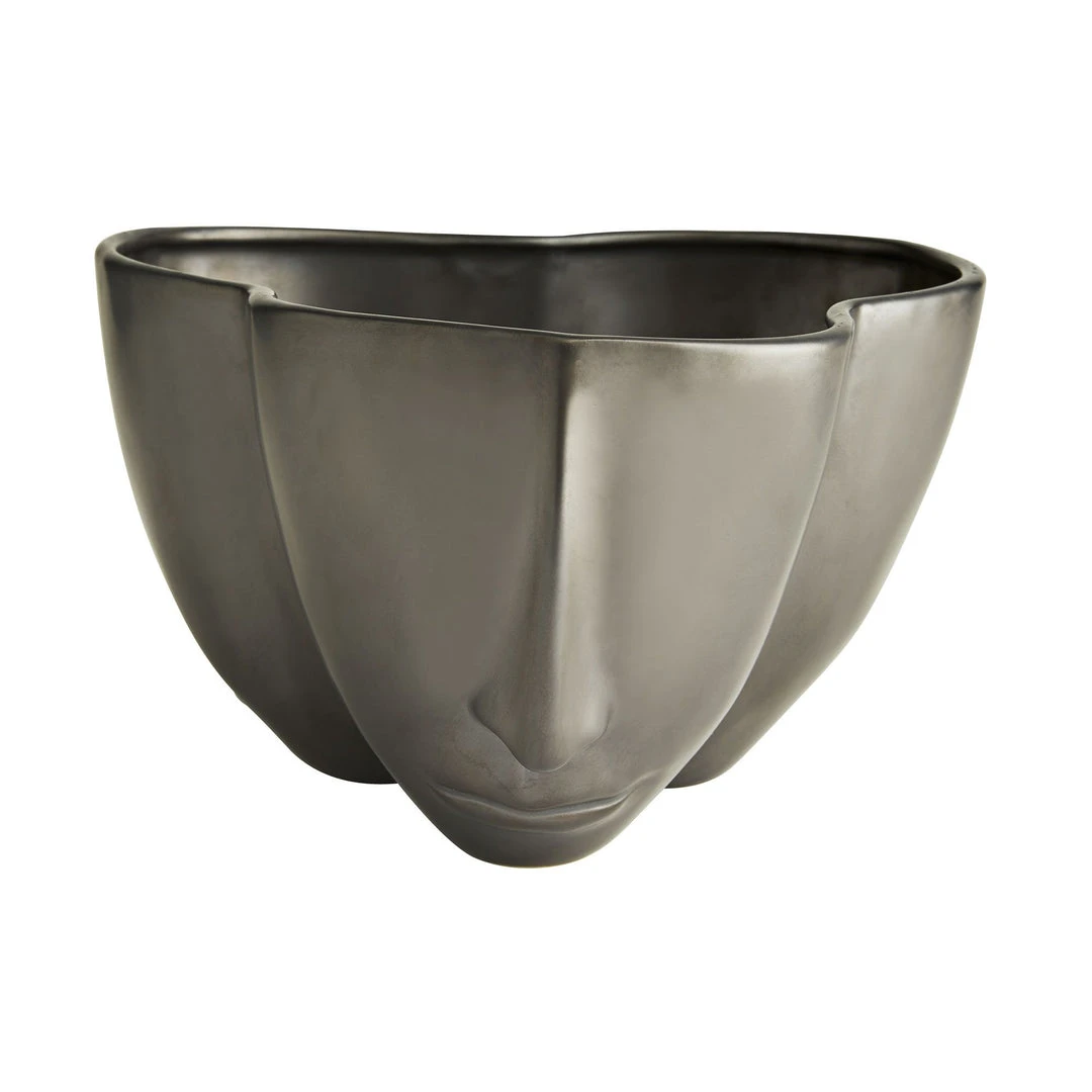 Figural art is transformed into a functional centerpiece with the Glare Centerpiece from Arteriors Home. A gunmetal glaze adds depth and a moody quality to the artistic structure, which takes the shape of a half-face form. This sculptural piece defines a tablescape with its artistic defiance. Pair with the metallic gold version for a stark yet striking contrast.