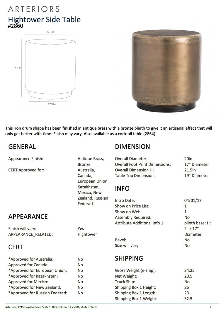 The iron drum shape of the Hightower Side Table from Arteriors Home is the perfect piece of accent furniture for entertaining. Finished in antique brass with a bronze plinth to give it an artisanal effect, the coloring of the Hightower is rich and warm. Place the Hightower side table in the familiy room or living room and enjoy chic style. Pair with the Hightower Cocktail Table for a complete designer look.