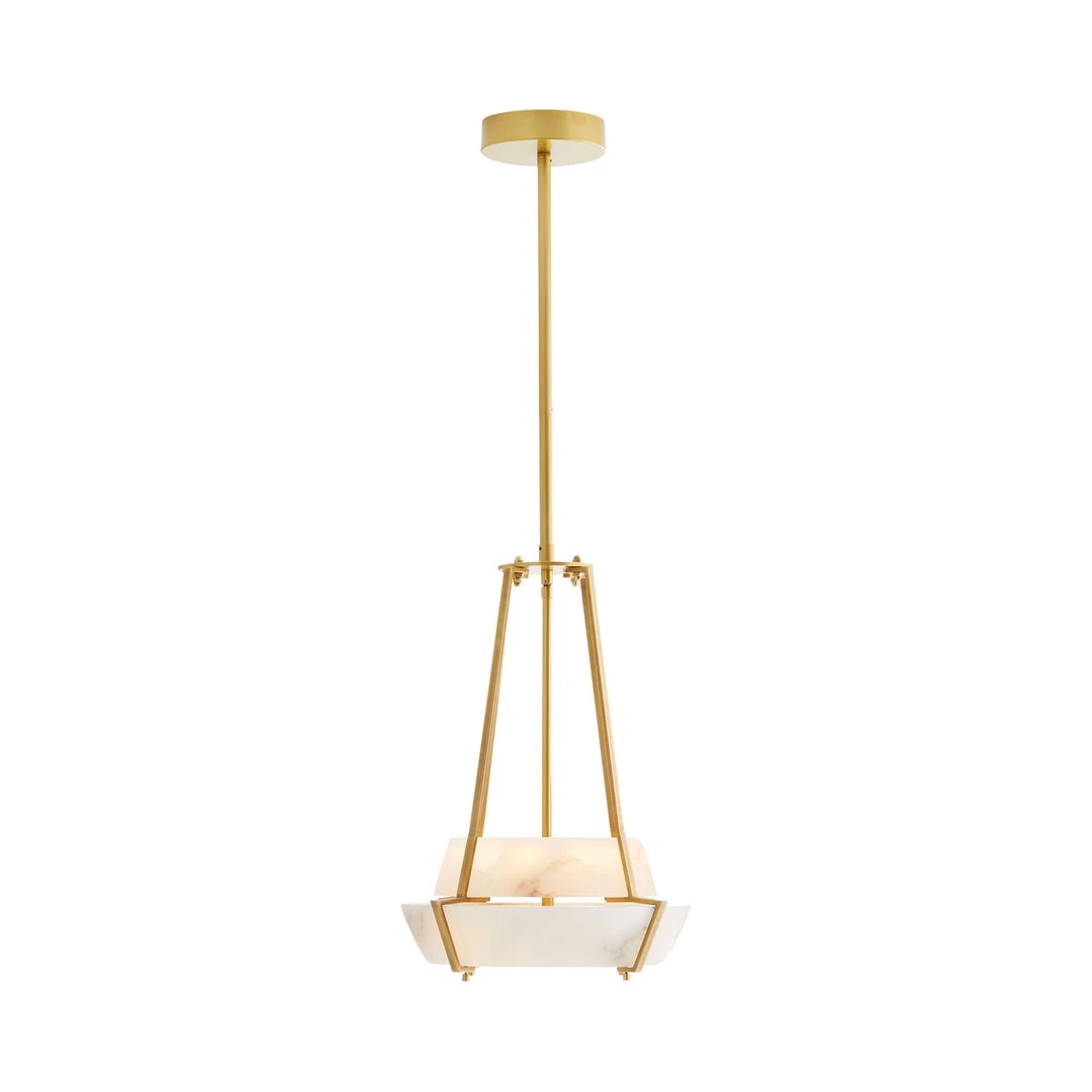 The Nova Pendant from Arteriors Home takes a modern approach to traditionalist pendant design. Two angular white alabaster rings are framed by antique brass iron in open form for a refined arrangement of elevated aesthetics. This layering of materials is strikingly stunning when not in use but is even more so when illuminated due to the integrated LED. ^Finish will vary. Additional pipe available (PIPE-180). Damp-rated although limited covered outdoor areas may affect the finish.