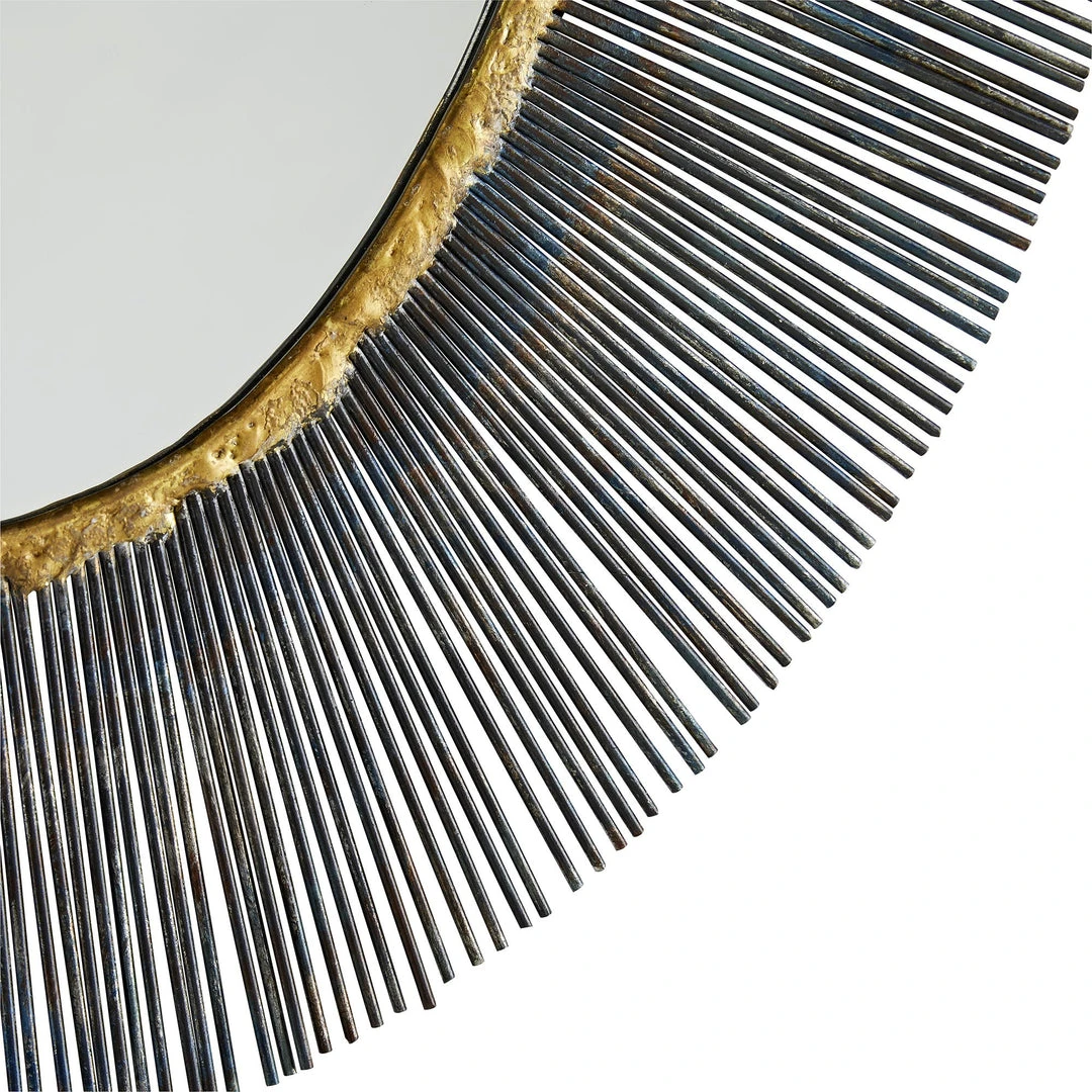 The Perseus Mirror from Arteriors Home features the popular sunburst design in an oval shape. Hundreds of small metal spokes, the frame is handmade by welding each one to the base, then firing the natural iron to get an almost iridescent finish. The plain glass mirror is surrounded by brass welding for a fully finished and elegant look. Because of its completely handmade nature, slight variances will occur with each.