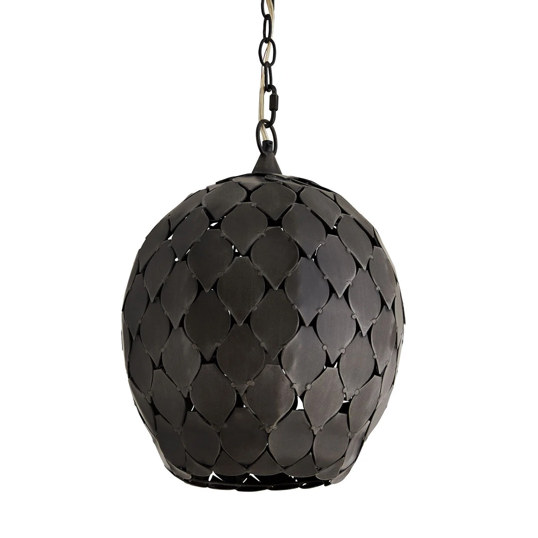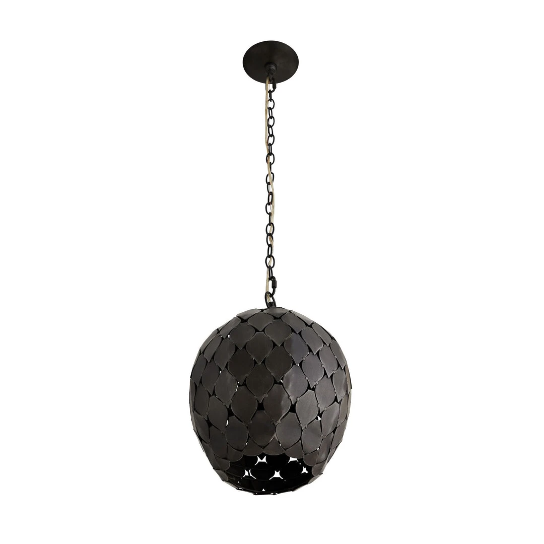 Crafted by hand, the Osgood Pendant in Bronze from Arteiors Home is the epitome of form meets function. Each rustic, diamond-shaped iron leaf is crafted by hand and pieced together to form a unique dome. Finished in bronze, the leaves are sculpted in a way that light emits from all angles of the imperfect shade. *Additional chain available (CHN-237). *Damp-rated, though limited covered outdoor conditions may affect the finish.