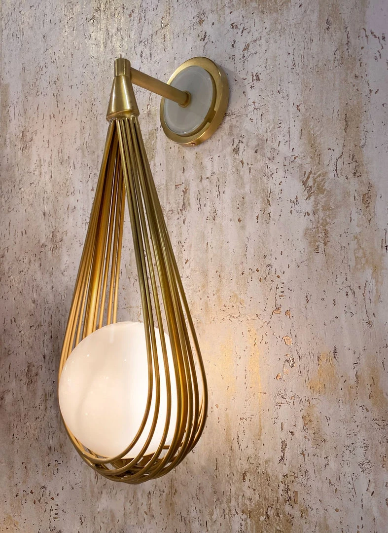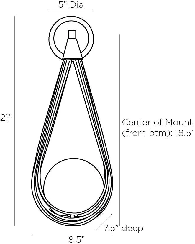 The incredibly unique design of the Ova Sconce from Arteriors Home takes inspiration from a pearl, sling-shaped pendant necklace. The teardrop silhouette is crafted from antique brass iron that showcases an opal glass bulb, which sits in the frame. A matching glass and antique brass iron backplate with an opal glass accent create cohesiveness throughout. Consider multiples for a more dramatic lightscape. *Damp-rated although limited covered outdoor areas may affect the finish.