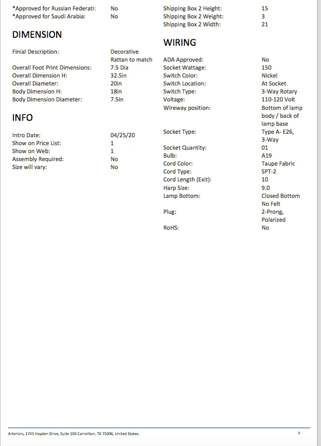 | Materials | Natural Rattan; Socket Wattage:150; Switch Color: Nickel; Switch Type:3-Way Rotary; Socket Type: Type A- E26 3-Way; Socket Quantity:01; Bulb: A19; Cord Length (Exit):10; Harp Size:9.0; Plug:2-Prong Polarized |