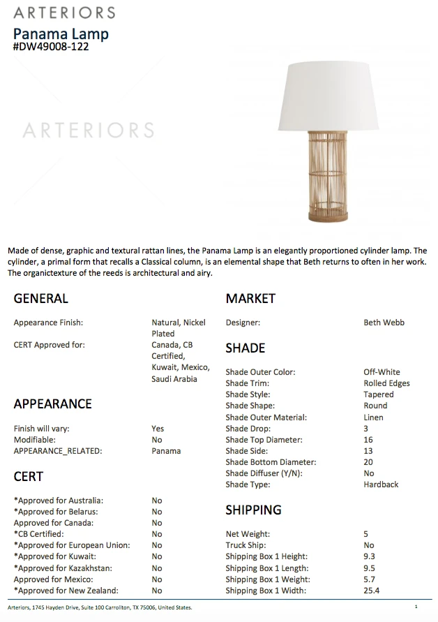 SKU: arteriors-home-4546677637168 Categories: Arteriors Home, Bedroom, Brands, Lighting, New, New Arrivals, Table Lamps, Table Lamps Tags: 60days, Arteriors floor lamp, Arteriors home, Arteriors lamp, Arteriors lighting, Beth webb, Natural rattan finish, Panama