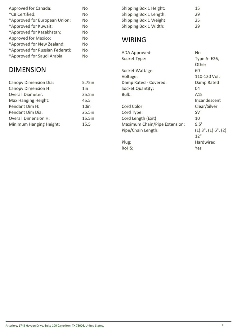 | Materials | Natural Iron; Gold; Gray; Antique Brass; (4) 60 watt bulbs required |