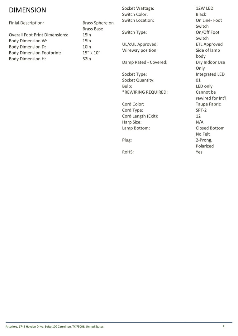 | Materials | Steel; Bronze Finish; Socket Wattage:12W LED; Switch Type: On/Off Foot Switch; Wireway position: Side of the lamp body; Socket Type: Integrated LED; Socket Quantity:01; Bulb: LED only; Plug:2-Prong Polarized |