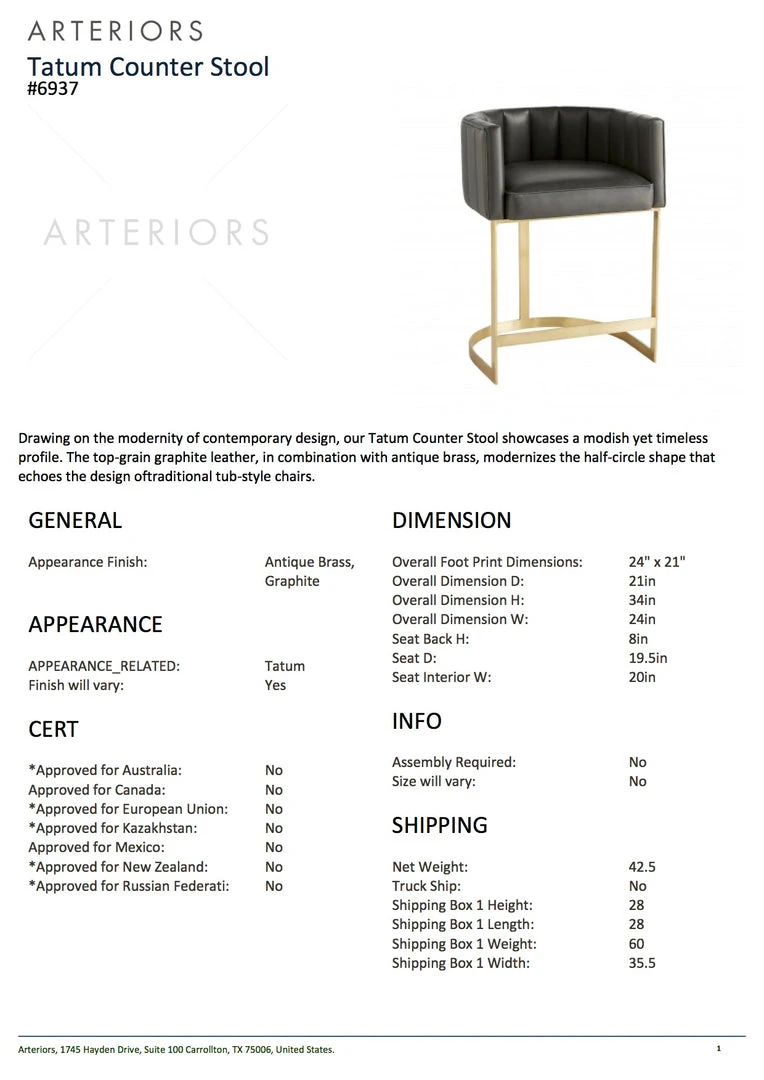 Drawing on the modernity of contemporary design, the Tatum Counter Stool from Arteriors Home features a timeless profile. The top grain mushroom leather called Morel paired with an antique brass base creates a comfortable and stylish design. Further modernized with a half circle shape, the luxury seat is versatile in the ways it can be used. The dropped back of this shapely neutral seat blends seamlessly into its arms, allowing it to easily slide under the counter to provide more room when not in use.