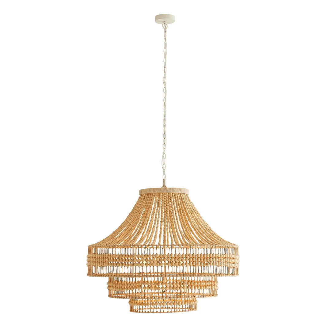 A twist on the traditional empire chandelier, the Tulane Chandelier from Arteriors Home projects a strong presence while remaining light as air. The tiered construction is crafted from hand cut wooden beads strung along an abaca frame, delivering a rustic feel to its feminine form. The large, open structure of this beaded chandelier allows light to cascade down each layer and brilliantly light up your surroundings. Due to the handmade nature, slight variances may occur. *Additional chain available (CHN-204).