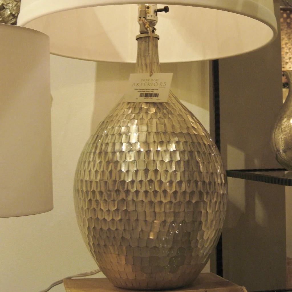 The Arteriors Home Walter Table Lamp is an elegant textured light. Featuring an oval mercury glass base, this modern table lamp from Arteriors is topped with a neutral round shade. The silver sheen of the Walter lamp makes it a great accent in the living room or bedroom.