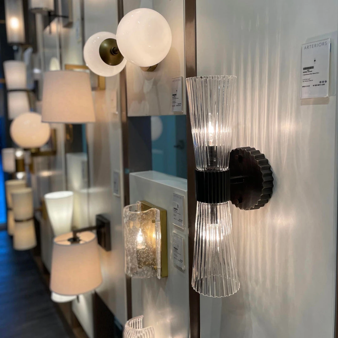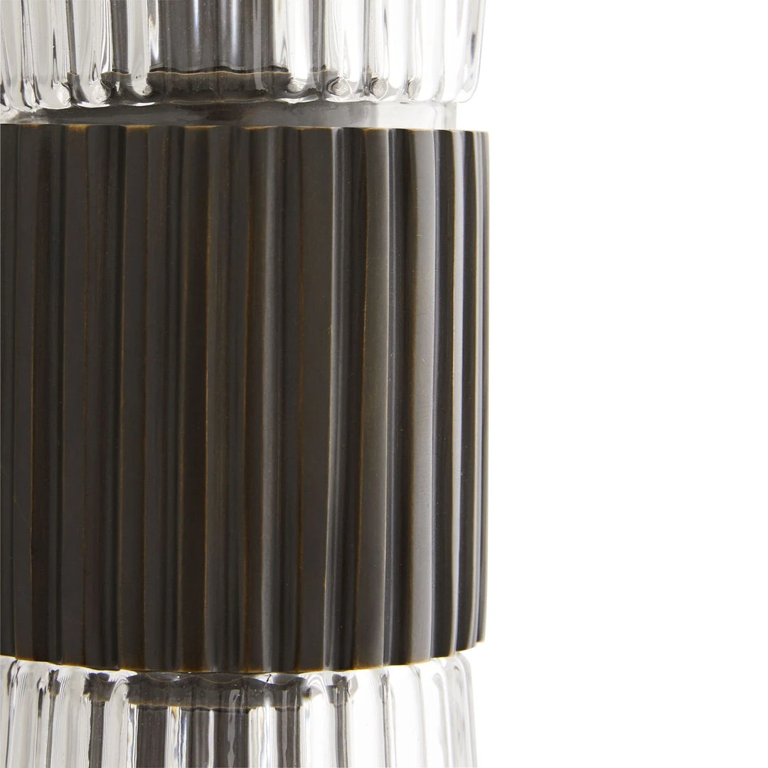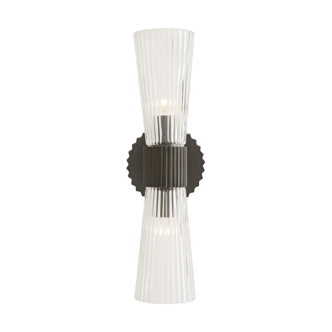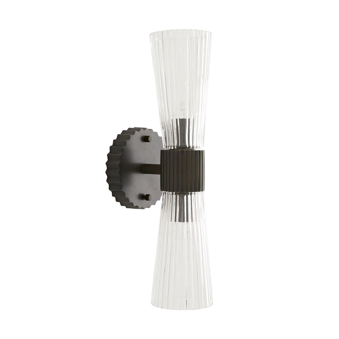 The tuxedo style Whittier Sconce in Bronze from Arteriors Home bestows a classic element to your space. The two light wall light features clear fluted glass shades, fixed on a bronze-finished steel plate, maximizing the light and adding texture to its directional pattern. Place the Whittier in pairs to create a double vanity story in a powder room, or for a more dramatic effect on a wall. Place the Whittier Sconce in indoor and outdoor spaces alike.
