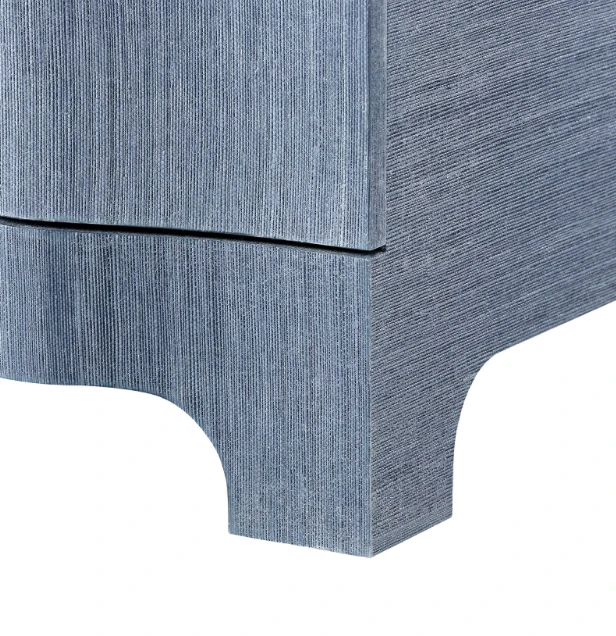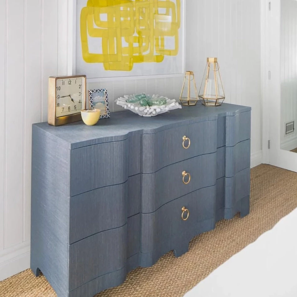 The Bardot Extra Large 9 Drawer Chest in Navy Blue from Bungalow 5 delivers a stylish nod to deco inspired design. With a serpentine front and inset ring pulls in polished nickel, this dresser has a lacquered grasscloth finish with a texture resembling a painted strie. With its classic and refined details, the Bardot Large 9 Drawer chest offers a classic design for your living room, office or bedroom.