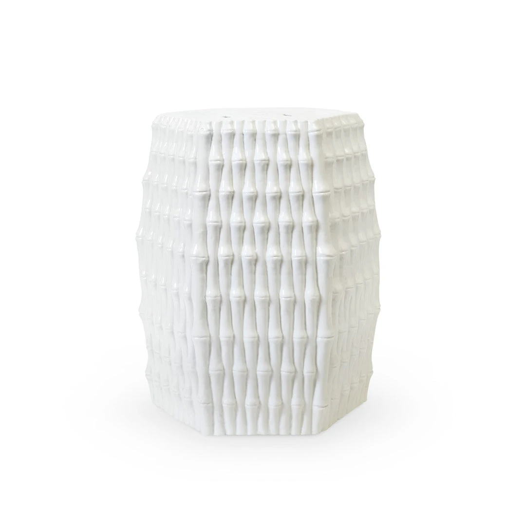 The Burma Stool or Side Table in white from Bungalow 5 brings the beauty of abstracted bamboo texture and sculptural interest to your space. This modern Asian garden stool is made of high grade porcelain and features cutouts on a reeded top to drain water. Use it as a casual side table for indoor and outdoor rooms alike.