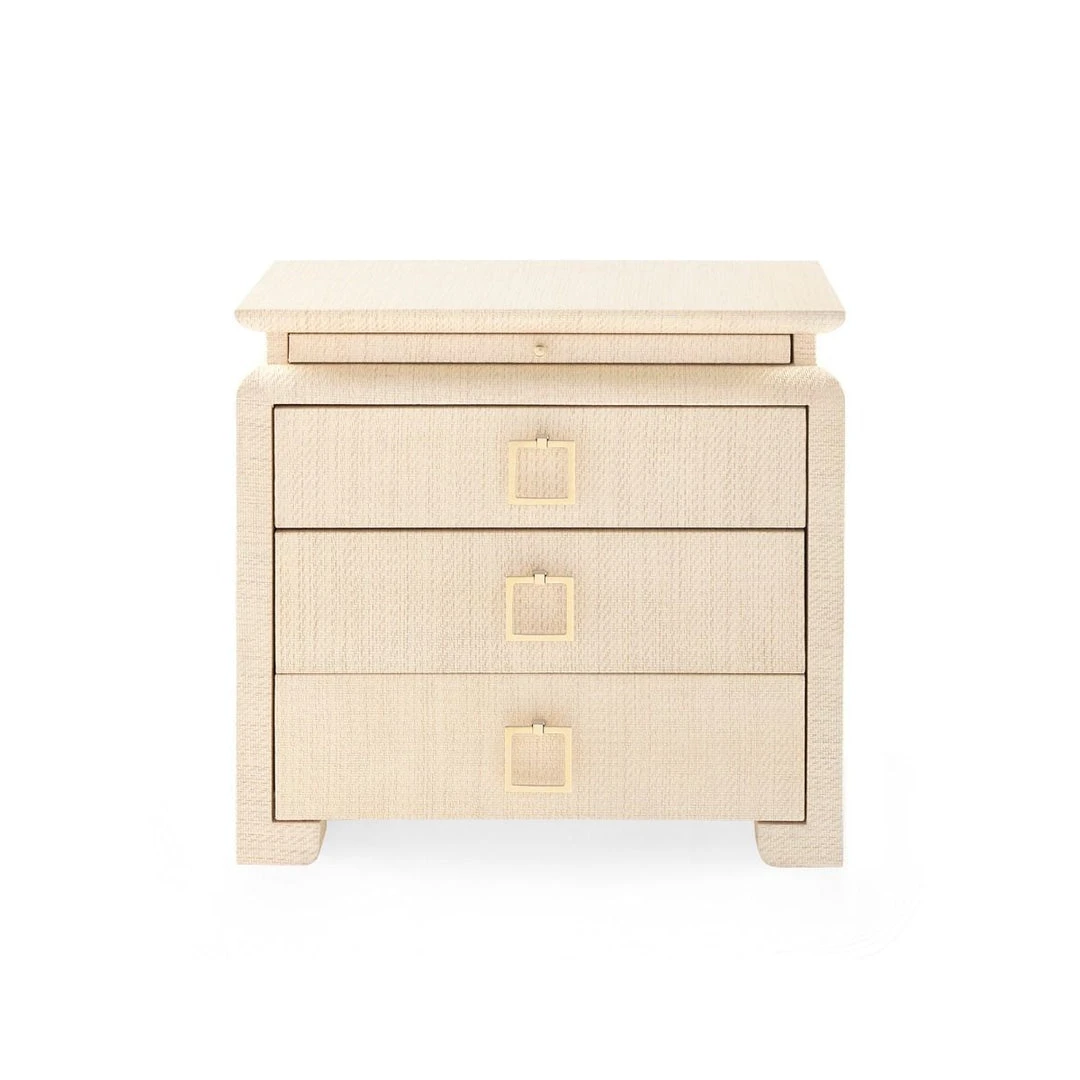Hand-wrapped lacquered linen brings a modern, luxurious feel to the Elina 3-Drawer Side Table in Natural from Bungalow 5. Three drawers provide ample storage, and a pull-out tray is a perfect place for storing a cup of tea or a drink. This versatile piece is as much at home as a bedside table or placed upon a landing, or as a stylish accent piece in a study or a den. The curved chow feet, our modern take on classical Chinoiserie, brings a whimsical and exotic feel to this piece.