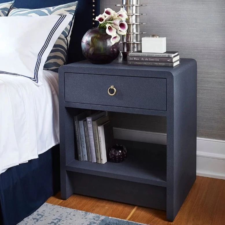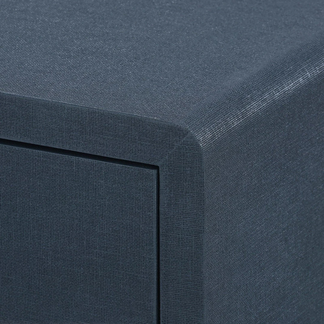 The Benjamin Linen 1 Drawer Side Table in navy blue from Bungalow 5 is a clean take on classic modernism. Its straight lines, flush-fitted drawers, and geometric shapes are balanced with distinctive soft corners, soft closing drawer glides and a ring pull finished in antique brass. With a lacquered linen finish, inset base, and open center, the mid-century inspired Benjamin Linen 1 Drawer Side Table fits lightly and seamlessly next to a bed or used as a sofa table in any modern space.
