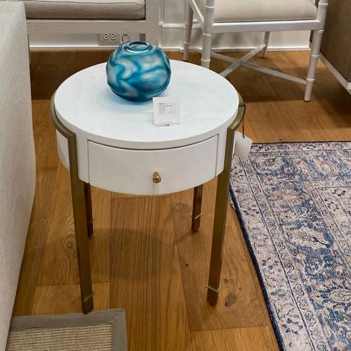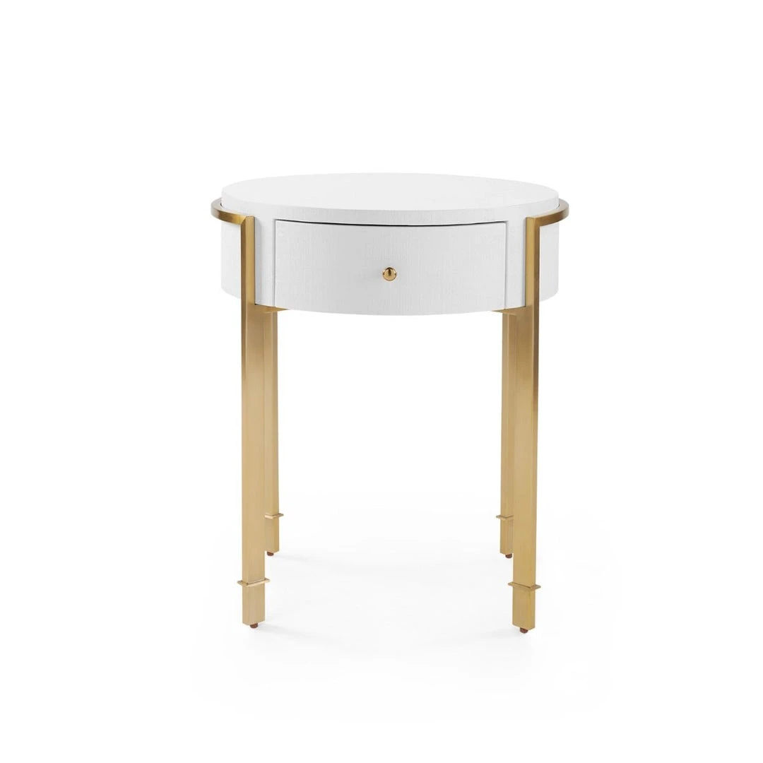 Lacquered heavy linen brings a modern elegance to the Bodrum Side Table in White from Bungalow 5. With a hand-crafted brushed brass base and a polished brass pull, these side tables exhibit a touch of whimsy and approachability. The Bodrum side table is perfect for when you need a side table to place between two chairs or the perfect companion side table for a low sofa. The drawer is the perfect place to store a television remote, matches for a scented candle, or drink coasters. Standout craftsmanship details include soft closing glides and oak veneer drawer interiors.