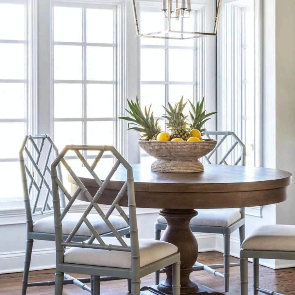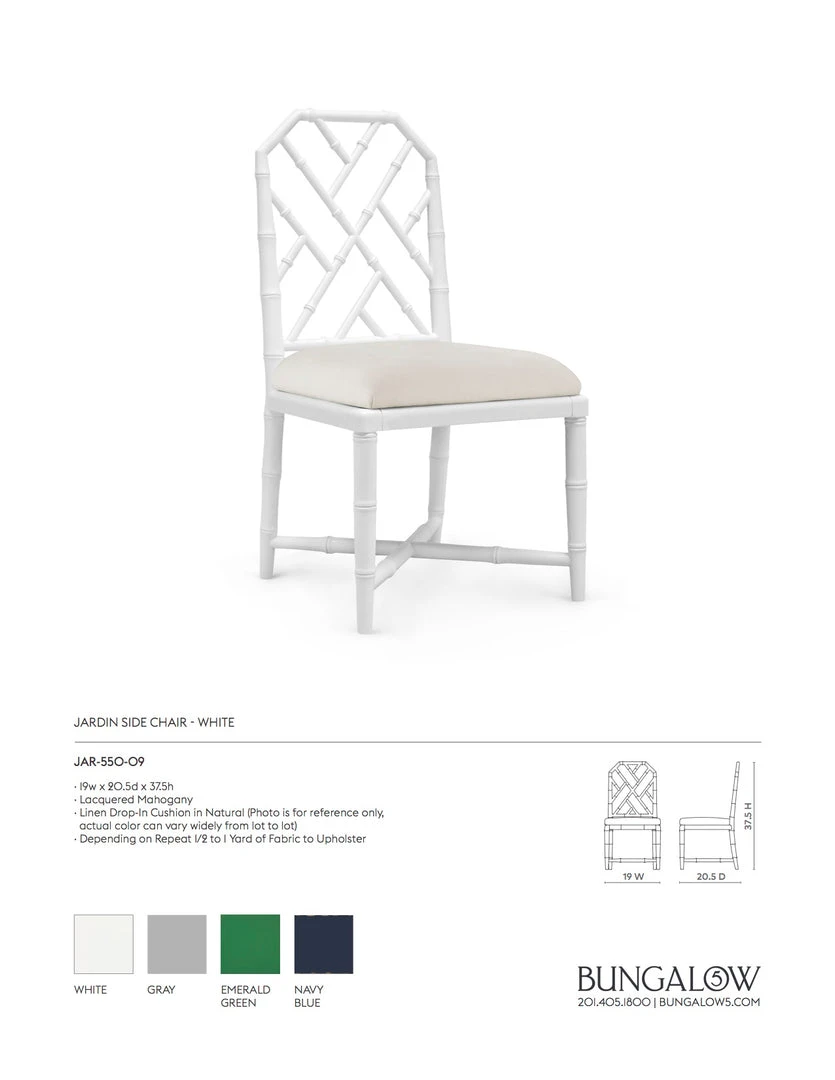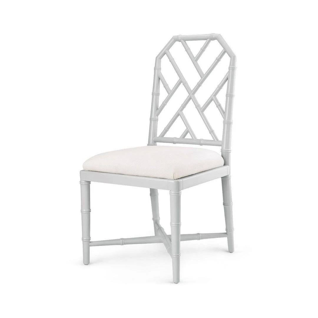 The Jardin Side Chair in Gray from Bungalow 5 is made of solid mahogany in the Chinoiserie style and finished in a gray lacquer. Chic design details include an elegant faux bamboo frame, lattice frets, and tapered legs, allowing this chair a sophisticated and graceful line. Simple drop in linen upholstery recovers easily when it comes time for a change. The Jardin is perfect for dining rooms, kitchens, and home offices.