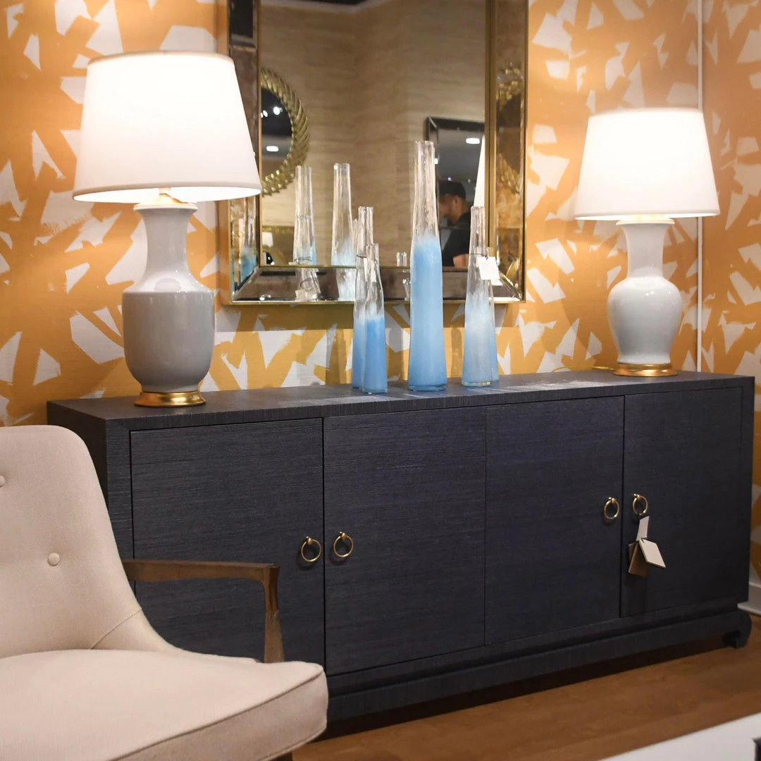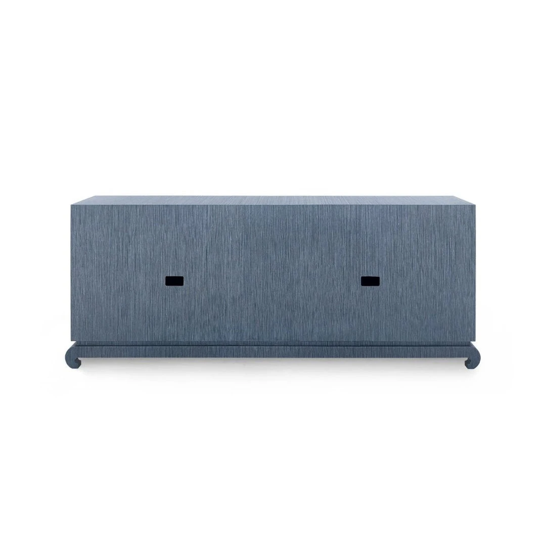 The Bungalow 5 Meredith Extra Large 4-Door Cabinet in Navy Blue pairs a geometric rectangular base with a whimsical and delicate curving chow foot. Featuring gold finish ring pulls, lacquered grasscloth and two adjustable shelves, this versatile piece is chic and stylish. Back panel openings conceal and organize cables making this the perfect piece of furniture for media rooms, great rooms or living rooms. Supported by gently curved Chow feet, the upscale Meredith also offers extra storage for other areas of the home or office.