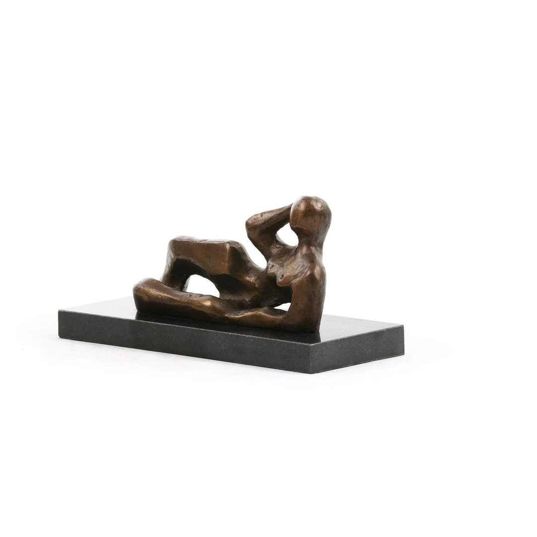 The Misia Statue in Bronze from Bungalow 5 is a reclining female figure in the recognizable post-war British style. Here, the human figure fuses with organic forms such as shells, pebbles, and bones. In an effort to move beyond war, these artists gravitated to pre-cultural and pre-rational inspirations. Particularly, they admired the monumentality and humanism of Toltec-Mayan sculpture. Our statue has distinctive voids together with the marks and texturing you might expect to see in a maquette for a larger work.