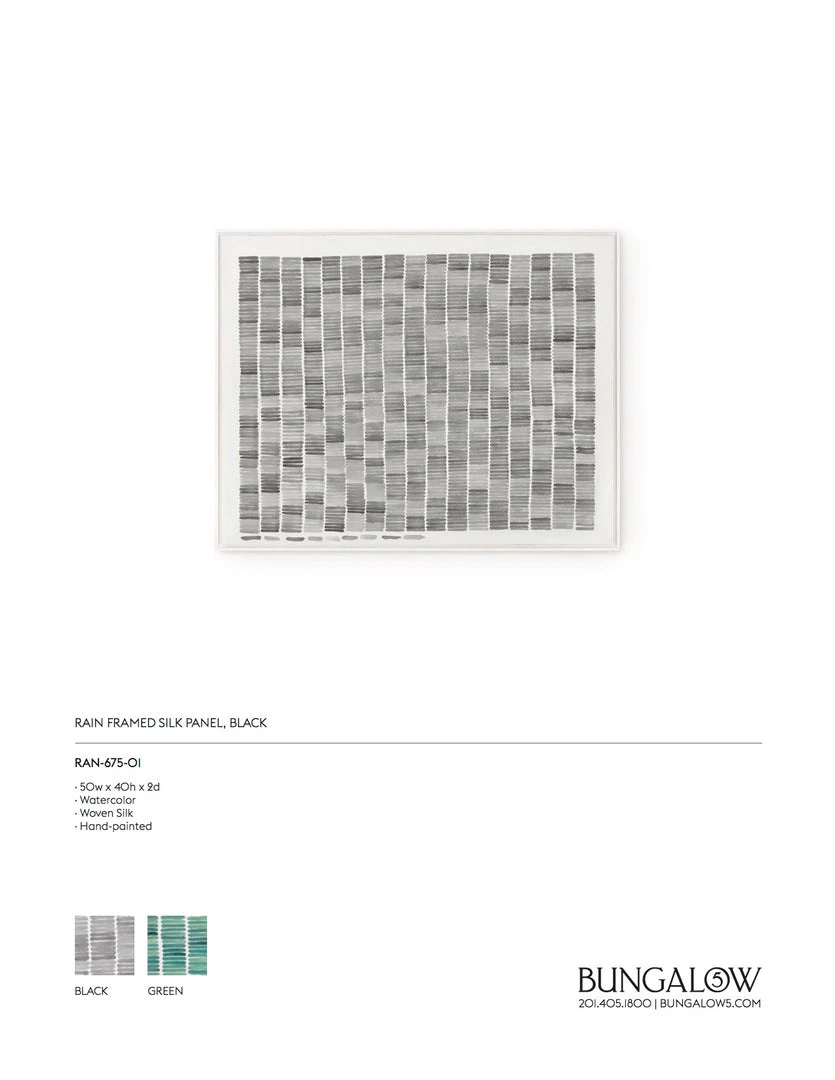 The Rain Framed Silk Panel in Black from Bungalow 5 was made as a collaboration between a small collective of artists. Different approaches with brushstrokes, variations of pressure, rhythmic patterns and abstract shapes suggest the enchantment of rain in this watercolor on silk. Display this stunning piece of artwork above a console in the foyer, over a buffet in the dining room or above a credenza in the home office.