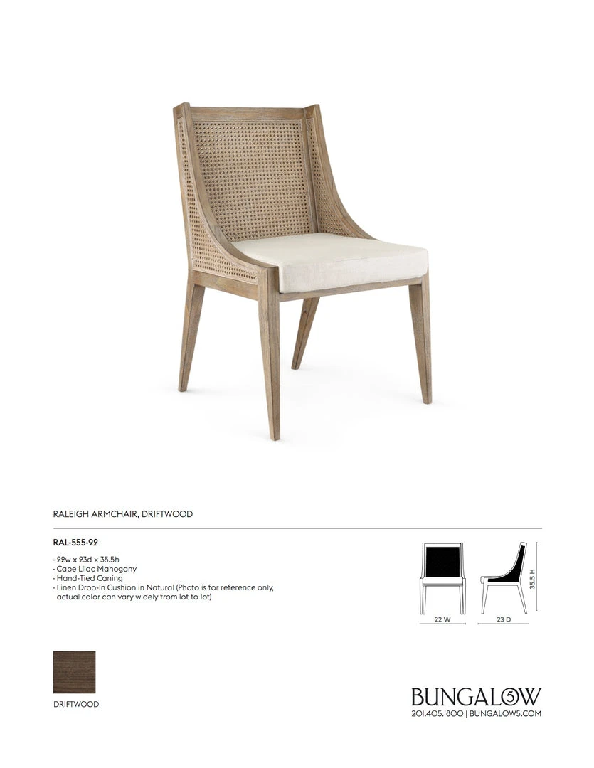 Bungalow 5 presents the Raleigh Armchair in Driftwood, offering equal parts style and casual comfort. Expert craftsmanship creates a contemporary look based on old world techniques. Utilizing sustainably harvested Cape Lilac Mahogany, artisans hand weave and tie the caning into a modern wingback silhouette. Place the Raleigh in multiples around your dining room or kitchen table or individually as a desk or vanity chair.