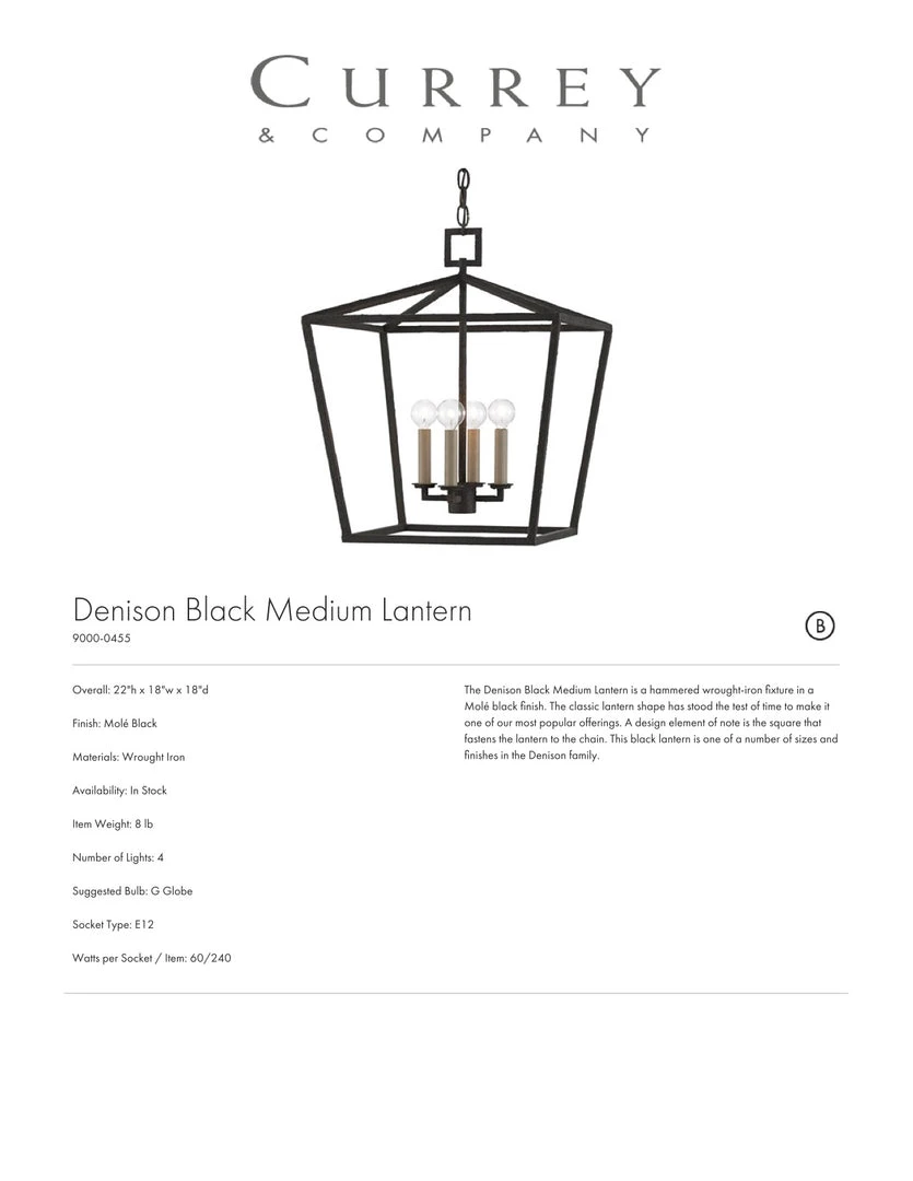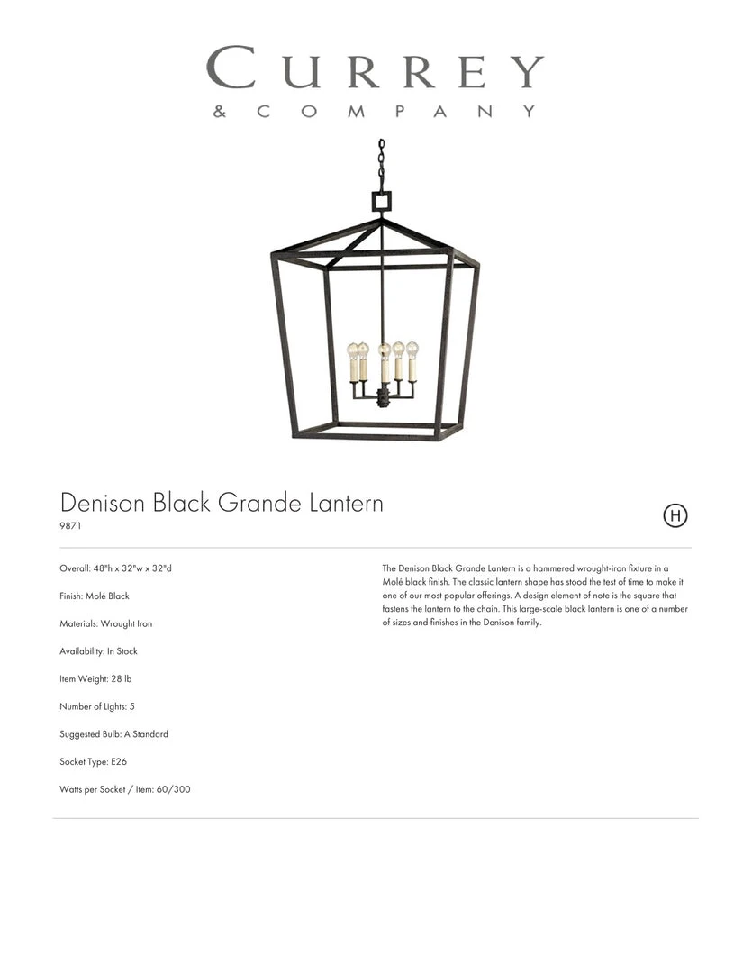 The Denison Lantern from Currey and Company features a cagey shape of wrought iron. The open frame pendant light allows for light to flow through your room. The classic shape of the Denison is a favorite that has been used in entryways, kitchens, and hallways. We love the dark black finish of the frame for a grounded, yet not overpowering effect.